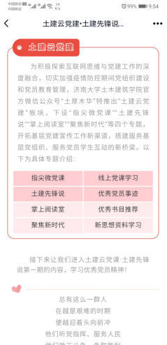 其中,“指尖微党课”组织线上党课学习,为广大师生提供党课学习资料,普及党的相关知识。“土建先锋说”宣传优秀党团员的先进事迹,为广大党团员树立榜样标杆,传递正能量。“掌上阅读室”向党团员推荐优秀必读书籍,培养良好的阅读习惯。“聚焦新时代”推出时政热点分析及党和国家的重要精神和思想学习资料,打造互联网思政教育工作平台。第一期“土建先锋说”推出了优秀退伍学生厉宁的事迹和个人感悟,第一期“指尖微党课”推出了学院退伍学生和即将入伍的同学共同录制的入伍感悟视频,受到广泛关注和好评,浏览量达600多,为征兵宣传起到了助推作用。
