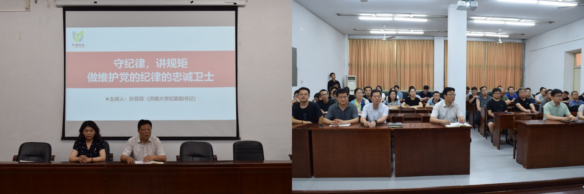 在学院会议室举办党纪学习教育专题党课。济南大学纪委副书记孙菲菲主讲了“青廉课堂”专题党课,学院全体教工党员参加了党课。
