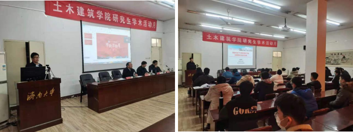 院长谢群老师致辞,山东大学土建与水利学院院长张庆松老师做学术报告。开幕式分三个环节进行:首先,杨院长宣布开幕式开始,并对到来的领导和专家进行介绍;随后,谢院长对本次活动致辞,提出学术活动月从2014年开始至今已举办多次,从活动之中看到了学生对于学术积极的态度以及学生在各个方面的创新,并提出几点建议:“第一,创新是每个研究生应该具备的能力,只有不断创新才能取得有效的成果。第二,探索是发挥个人所具备能力的一种方式,只有拥有不断探索的精神才能发现问题、解决问题。第三,新的灵感,只有不断查阅文献才能获得新的灵感。”最后,由张院长做学术报告。