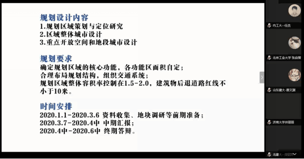 城乡规划系的部分师生参加了由“北方规划教育联盟”组织的城乡规划专业本科生联合毕业设计线上开题。除我校以外,此次参加开题的还有大连理工大学、北京工业大学、沈阳建筑大学、北京建筑大学、内蒙古工业大学、吉林建筑大学、山东建筑大学和天津城建大学。