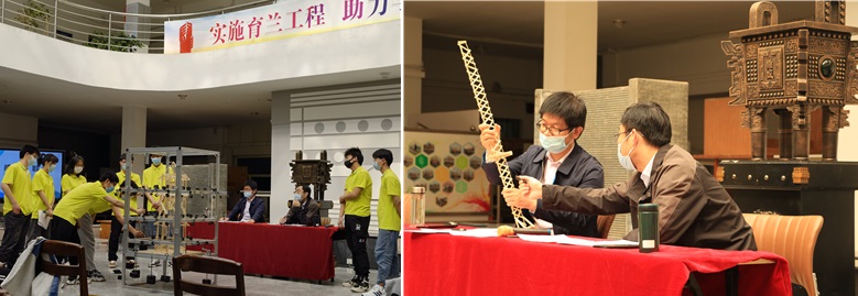 本次参赛模型以三重木塔结构为基本单元,主要包括设计作品理论方案介绍、模型加载测试、评委现场提问与选手答辩三个环节。参赛选手在第一环节对设计作品的模型制作及主要参数、结构受力分析、节点构造与施工等方面进行现场陈述;陈述过程中,模型加载测试也在紧锣密鼓进行,每项作品要求针对竖向荷载、扭转荷载及水平荷载三种荷载工况进行空间加载试验。每个经受住三轮加载测试的模型,都会获得现场参赛选手纷至沓来的掌声;模型加载过程中,评委老师对各项参赛作品都进行了详细点评,称赞参赛选手的坚毅力、创造力与团队协作能力,并针对作品结构设计的不足提出相应改进意见,这对于参赛选手提高理论与实践水平大有裨益。