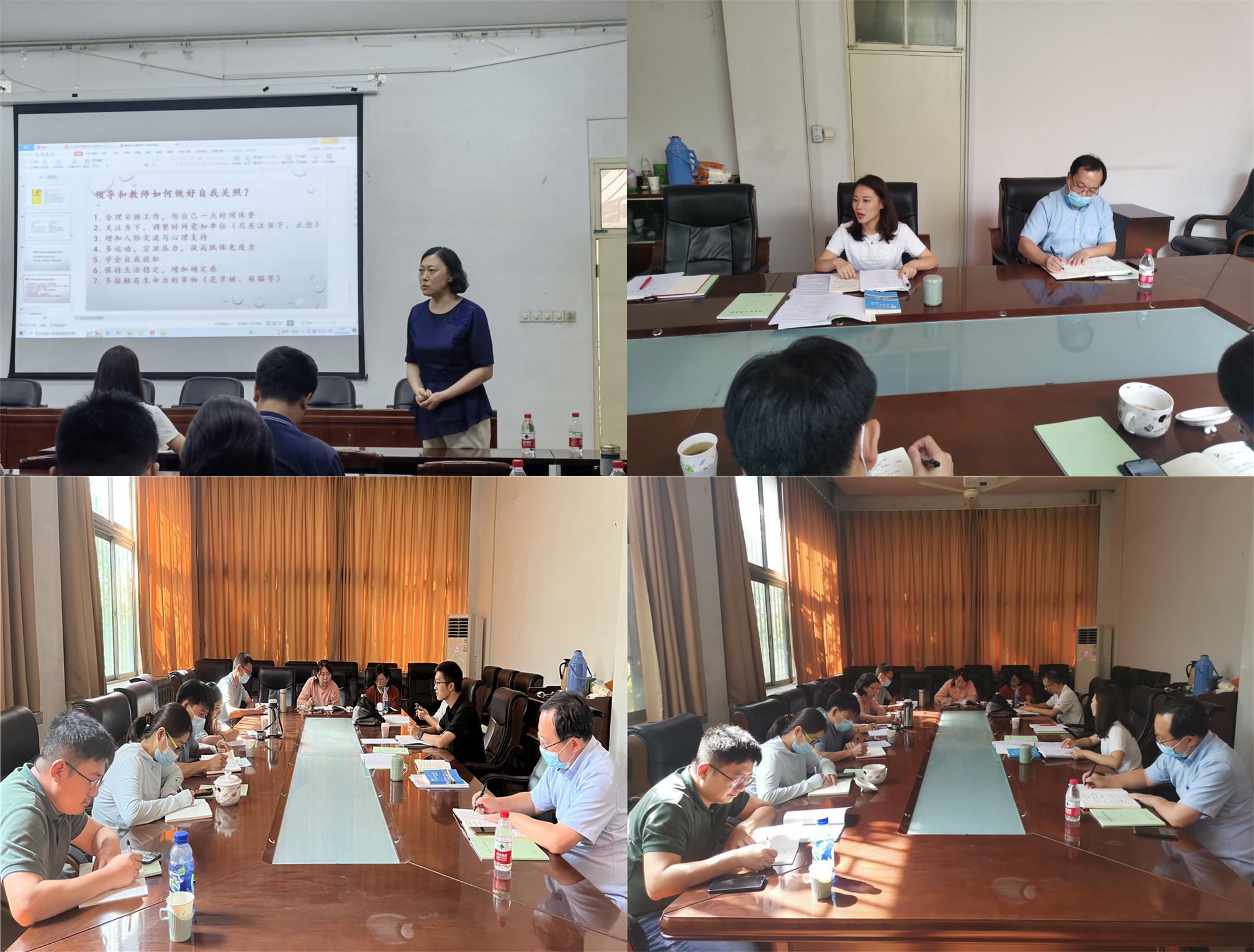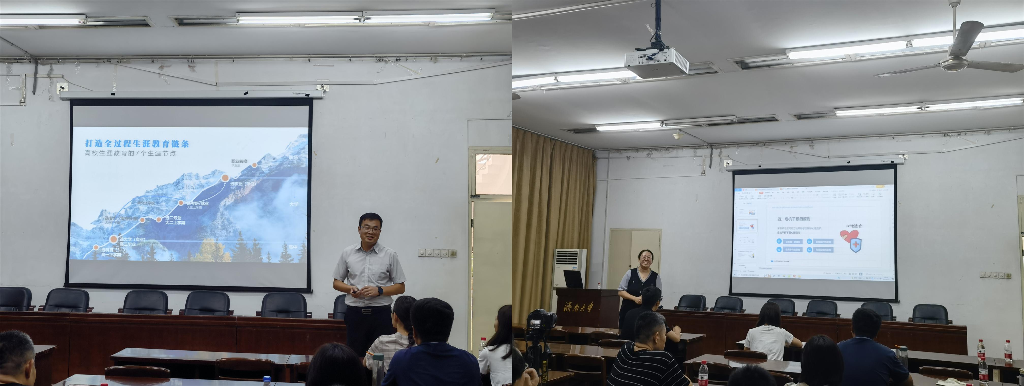 下午学校学生生涯发展指导中心主任张晶就如何做好大学生生涯规划指导做了专题报告。张晶指出大学生由高中步入大学,自身角色正经历由“单一”到“多元”的转变,需要给予大学生适时的生涯教育。张晶根据多年学生工作经验与总结,认为应打造全过程生涯教育链条,将大学生生涯划分为7个关键节点,并根据大学生学期特点,将高校生涯教育划分为5各阶段,根据各阶段不同的特点以及学生发展目标,分方向、分类别开展生涯教育指导。心理指导中心主任李素洁以心理教育工作技能培训为主题从实操层面给学院班主任、辅导员做了报告。从疫情对学生的心理影响、如何正确判断心理危机事件、如何在谈心谈话中发现心理危机、危机干预工作流程、危机干预者的情绪处理、危机干预的注意事项等几个方面介绍了大学生心理危机事件相关知识。