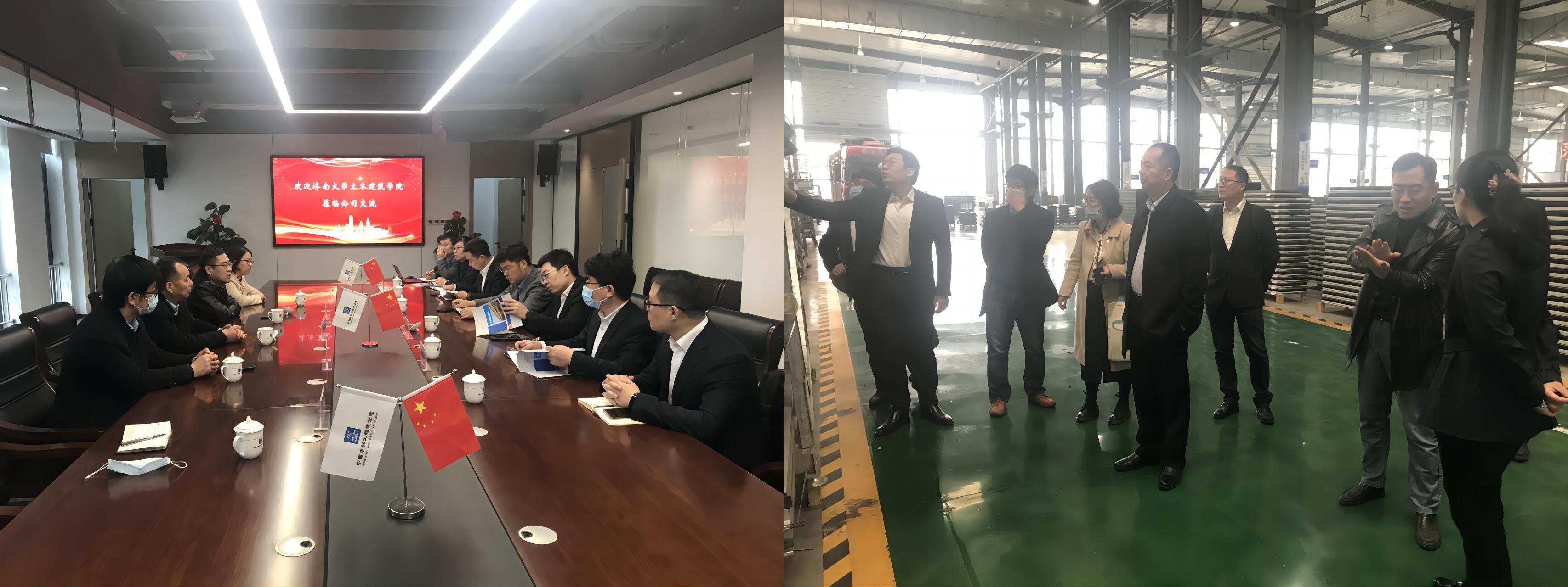 中建八局建筑科技(山东)有限公司董事长高腾、中建八局二公司设计院书记梁汝鸣、中建八局建筑科技(山东)有限公司科技中心经理孔昕、中建八局二公司设计院总工葛序尧等出席活动。高腾董事长对刘效东一行的到来表示欢迎,并带领参观了企业智造车间与示范工程,介绍了企业近况。他希望校企双方进一步加深科研交流,拓展合作空间,形成优势互补,共同打造校企合作的示范平台。