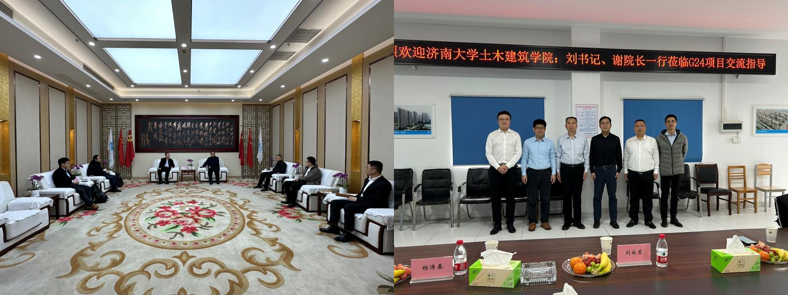 刘效东介绍了学校及学院的发展情况,谢群就学院社会服务项目进行了介绍,希望校企双方在学生就业,技术研发等领域开展合作。随后一行人参观了南京G24项目A地块总承包工程项目,并在工程技术上与项目部开展交流探讨。