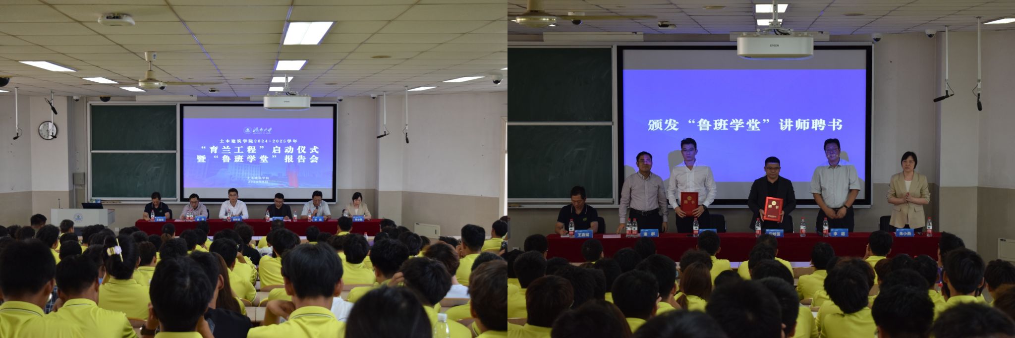 举行2024-2025学年“育兰工程”启动仪式暨“鲁班学堂”报告会。学院杰出校友、中直科创股份有限公司董事长宋修国和中建八局一公司济南公司党委书记、总经理谢新坡应邀出席。学院党委书记李超、院长谢群、党委副书记、副院长朱小燕、副院长王嘉斌出席了活动,全体2024级学生参加了活动。