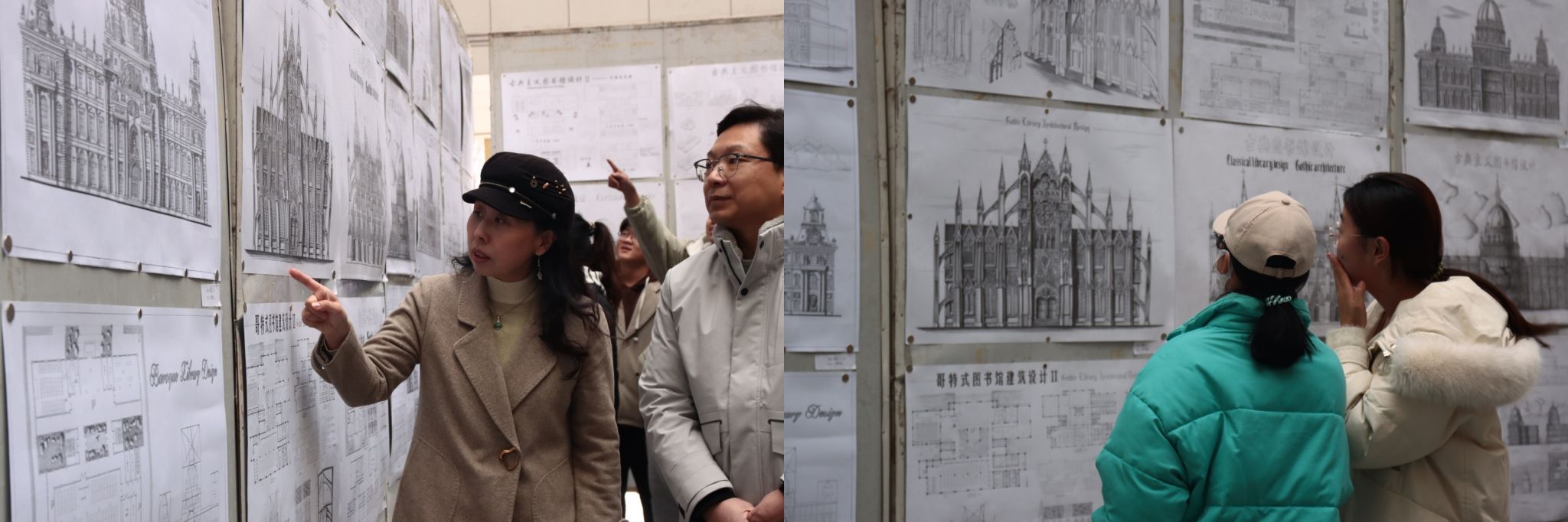 此次作品展以图书馆设计为主题,展出作品中既有以哥特式、巴洛克式风格为代表的西式建筑,也有通过飞檐翼角、斗拱彩画展现感染力的中式建筑。展示过程中,老师们对作品进行了细致专业的点评,当学生针对画作提出问题时,老师们也会耐心地作出解答,遇见有特点的作品时,老师与学生们共同讨论展出作品的优点与可以改进的方向。出席领导与老师们充分肯定了此次参展作品的专业水平,参展与欣赏作品的学生们也通过此次作业展丰富了自己的专业知识。