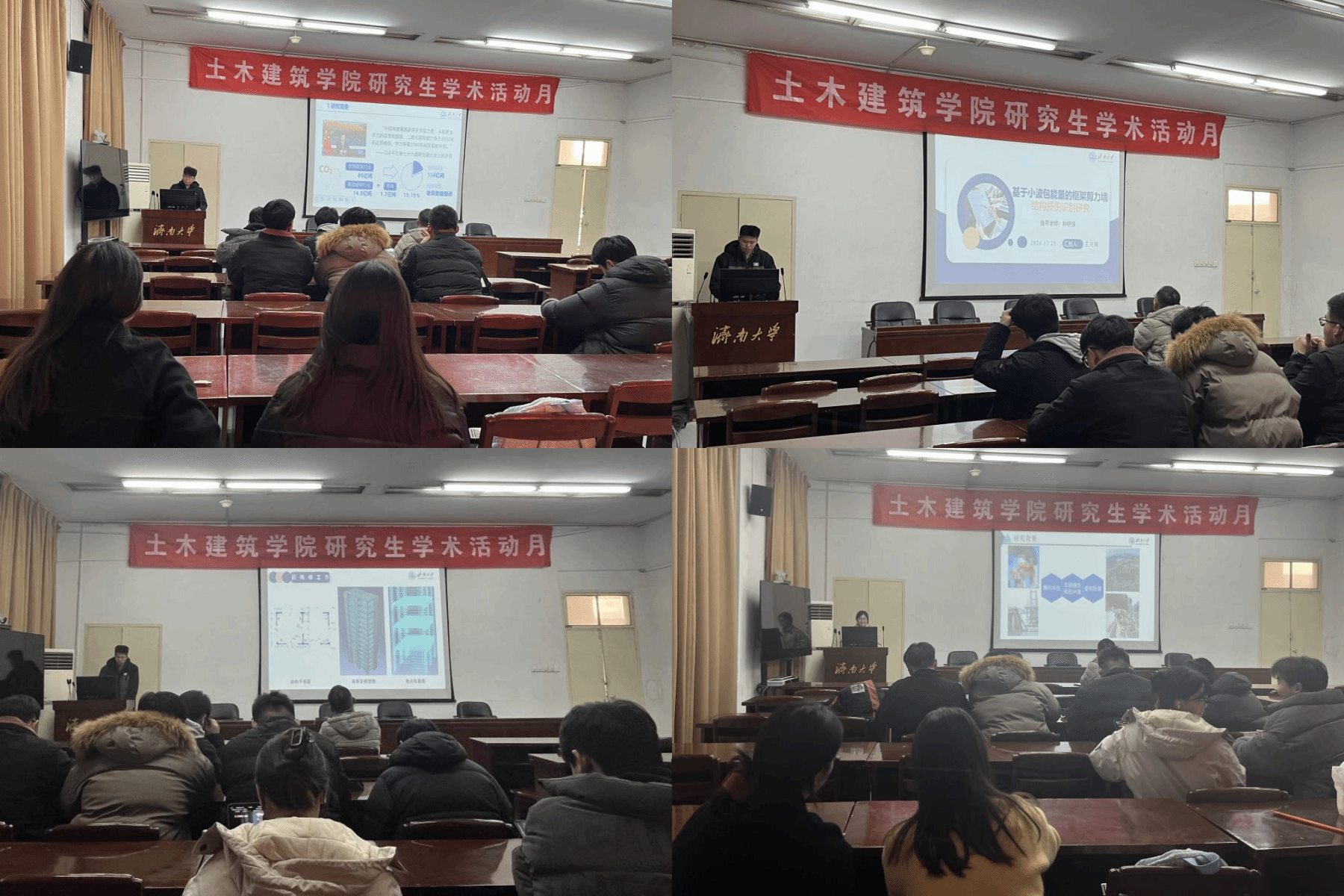 曾庆龙以“再生微粉泡沫混凝土性能试验研究”为题,以再生微粉为原料制备的泡沫混凝土在物理、力学、耐久性等方面的性能表现及其影响因素,并通过试验进行分析测定,旨在为其工程应用提供科学依据;刘燕云以“基于埋入式压电传感的混凝土早龄期及损伤监测研究”为题,通过分析传感器所获取的数据来评估混凝土结构的健康状态和可靠性为混凝土结构的施工质量控制、维护管理等提供技术支持和决策依据;王福豪以“再生混凝土细骨料制备高延性水泥基复合材料研究”为题以再生混凝土细骨料为原料来制备高延性水泥基复合材料的工艺、性能、机理及其应用潜力等方面的内容;王兴辉以“基于小波包能量的框架剪力墙结构损伤识别研究”为题对框架剪力墙结构在各种工况下可能出现的损伤进行特征提取、分析判断,从而实现对其损伤位置、程度等方面的精准识别,以保障结构的安全性和可靠性。