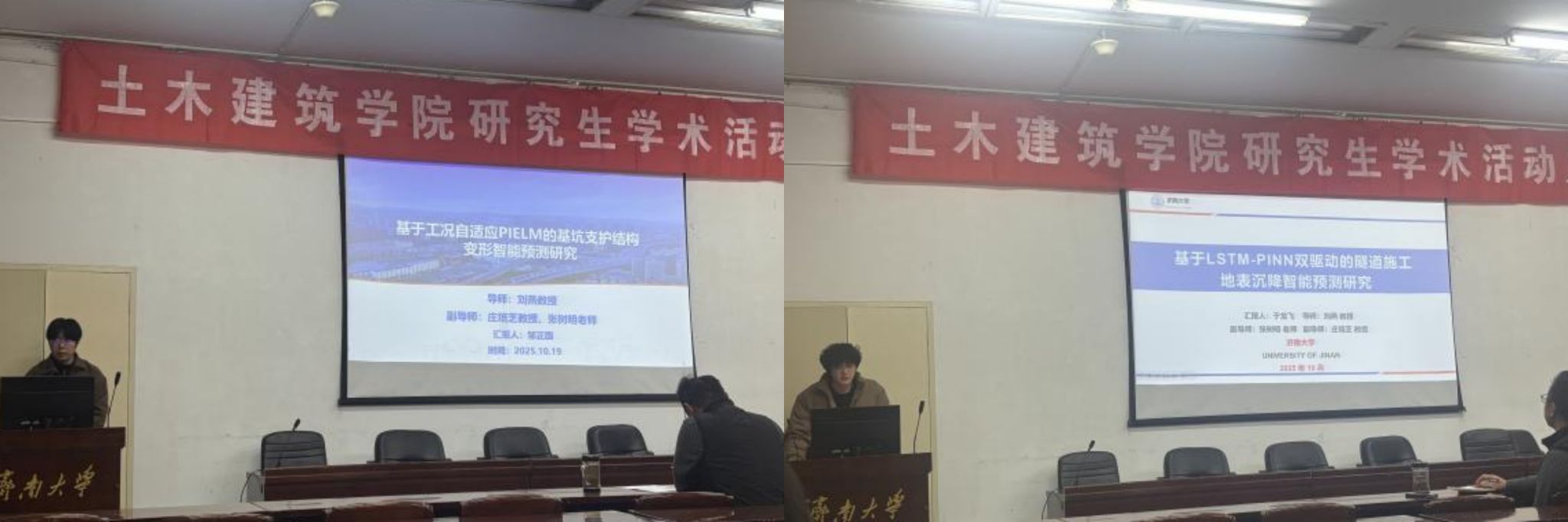 刘旭亮汇报《固废协同改良疏浚淤泥制备种植土的配比优化与性能研究》,通过固废协同改良淤泥,实现疏浚废弃物的资源化利用。刘浩帆分享《基于压实稳定性的细粒土路基压实质量评价方法研究》,构建细粒土路基压实评价体系,提升路基工程施工质量。韩猛介绍《挠曲电效应下双层膜的稳定性分析》,探究挠曲电效应对双层膜稳定性的作用机制,为微纳器件设计提供理论参考。于龙飞汇报《LSTM-PINN双驱动的隧道施工地表沉降智能预测研究》,融合LSTM与PINN技术提升沉降预测精度,助力隧道施工安全管理。