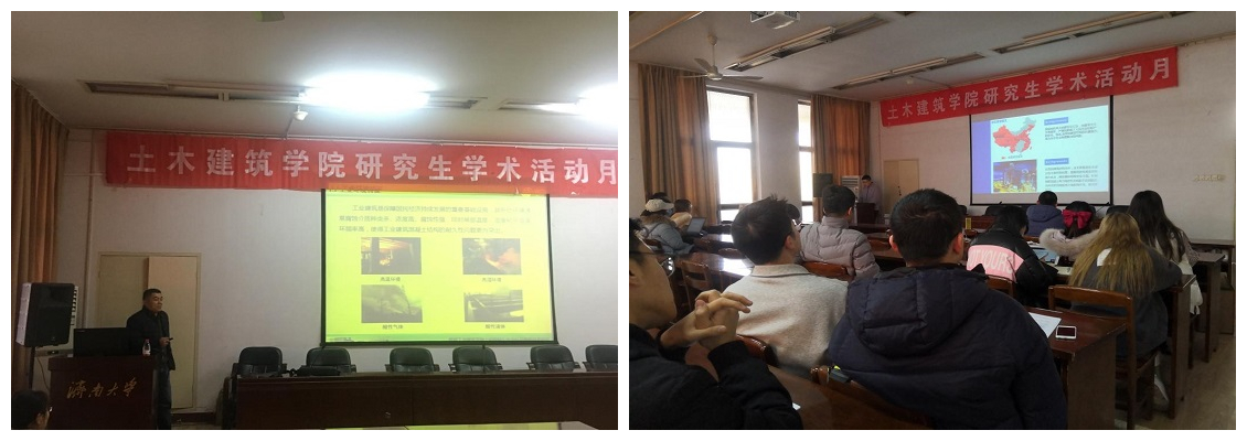 林明强副教授就“工业建筑混凝土结构耐久性评估及修复技术研究”做了主题学术报告。在报告上,林老师根据其研究的国家重点科研项目为根据,从课题背景、取得技术成果、成果创新点、示范工程、专家评价意见、经费使用情况、人才培养与管理运行七个角度进行讲述。林老师首先介绍了工业环境对混凝土结构耐久性的影响,接下来讲述了如何构建工业建筑混凝土结构耐久性环境指标体系,如何建立典型工业环境混凝土结构性能退化模型,最后提出了工业环境混凝土结构耐久性修复技术。