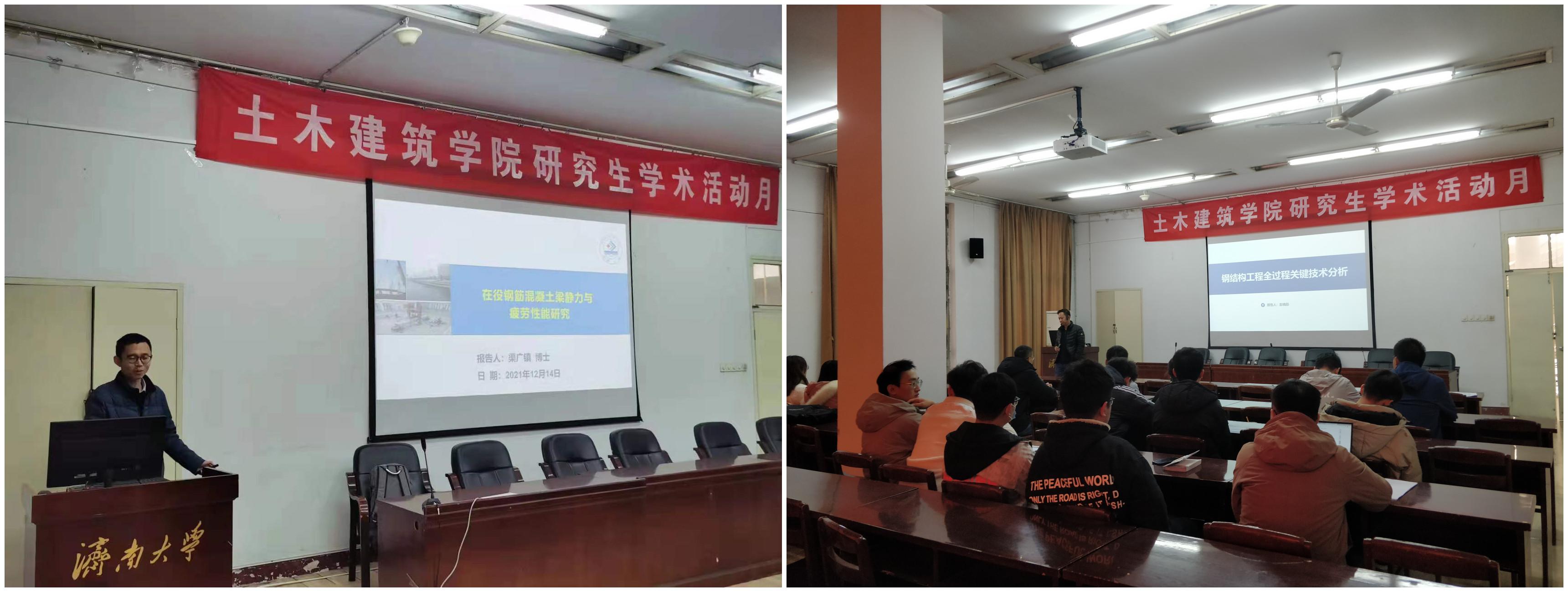 在本次学术报告中,渠广镇老师做出题为“在役钢筋混凝土梁静力与疲劳性能研究”的主题报告,首先向在场师生介绍了静载和疲劳下梁的挠度变化、裂缝开展、混凝土应变及钢筋应变的变化特点,然后总结了静力和疲劳损伤的发展规律。渠老师的精彩报告得到了与会师生的阵阵掌声。接下来,彭晓彤教授就“钢结构工程全过程关键技术分析”做了主题学术报告。彭老师在进行报告的同时,强调了与时俱进、了解行业行情是建立目标、实现创新、迎来研究领域上技术之本质飞越的前提条件,鼓励广大同学脚踏实地、踏踏实实地进行学习及研究工作。最后,15位研究生就各自的研究方向做出相应报告,在报告中,同学们相互探讨,积极交流,学术氛围浓烈。