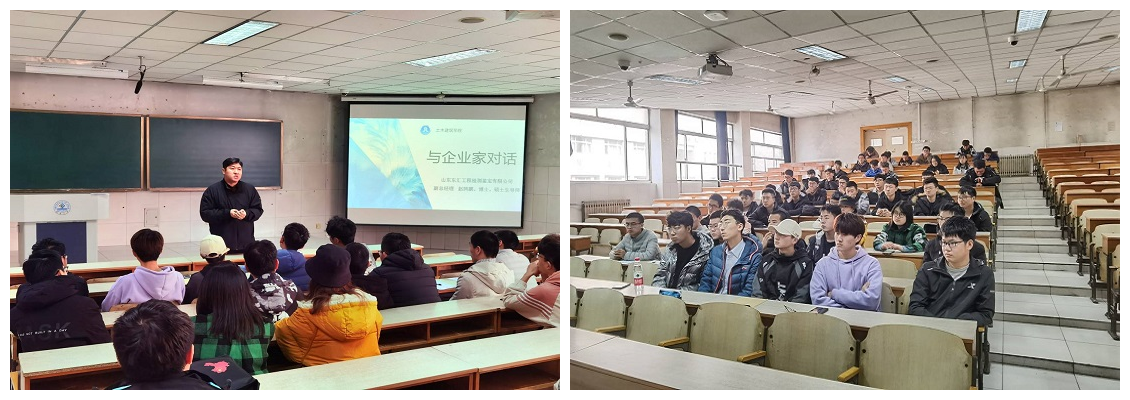 于2J205开展了“与企业家对话”座谈会,邀请山东东汇工程检测鉴定有限公司副总经理赵鹍鹏讲话,土建学子积极参与。