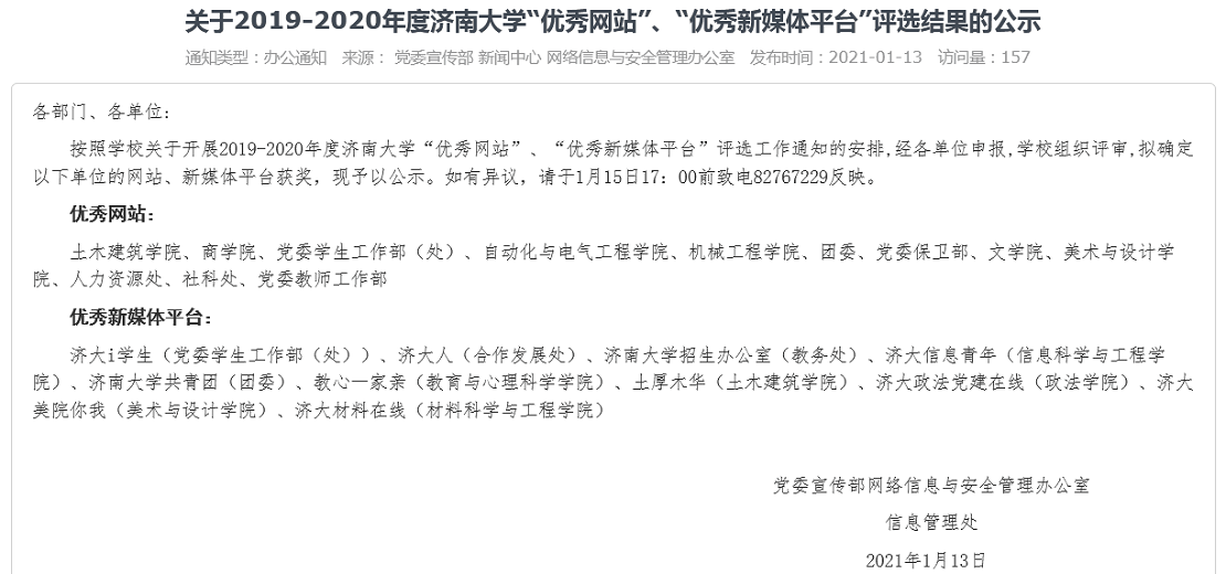 1月13日,济南大学2019-2020年“优秀网站”“优秀新媒体平台”评审结果揭晓,天天棋牌