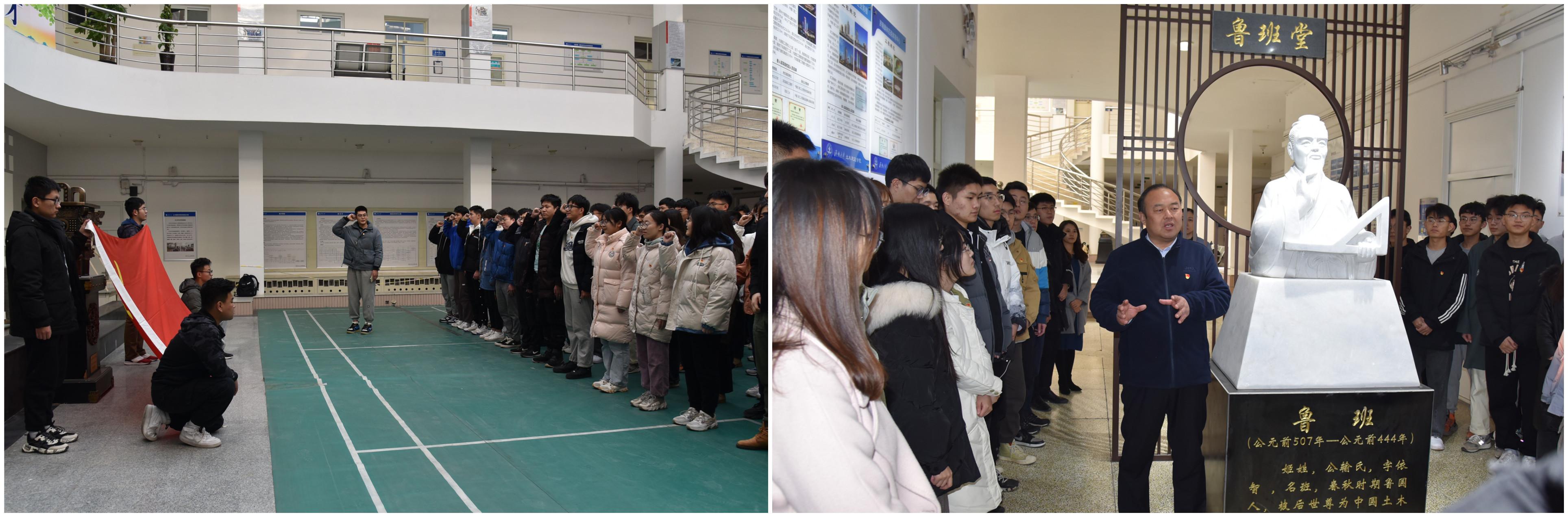 仪式伊始,预备党员在学生党员代表的带领下,面向党旗庄严宣誓“我志愿加入中国共产党……!”,宣誓声音铿锵有力,振奋人心。宣誓过后,栾志强带领预备党员前往鲁班堂开展主题党课活动。在鲁班堂内,栾志强结合同学们对十九届六中全会精神的学习情况再一次强调了学习党史及党的基本理论知识的重要性,要求党员要持续不断的加强理论学习,深刻领会党的百年奋斗重大成就和历史经验及新时代中国共产党的历史使命,并将个人的发展融入国家复兴大业。在鲁班堂前,栾书记介绍了土建学院优秀校友代表获得鲁班奖的项目及他们的成长故事。曹晓岩、李永明、宋修国、刘福顺等这些优秀校友追求卓越、无私奉献的精神展示出了土建人大国工匠精神和鲁班文化的传承,是真正的国家建设者,为基建强国的响亮名声贡献了力量。栾书记号召在校学生以他们为榜样,踏实学习,合理定位,目标端正,敢于吃苦。他提出四点希望,一是加强政治理论学习,提升政治理论素养;二是阅读经典文学作品,远离网络快餐文化;三是学习优秀校友精神,增强爱校荣校情怀;四是弘扬大国工匠精神,树立正确职业理想。