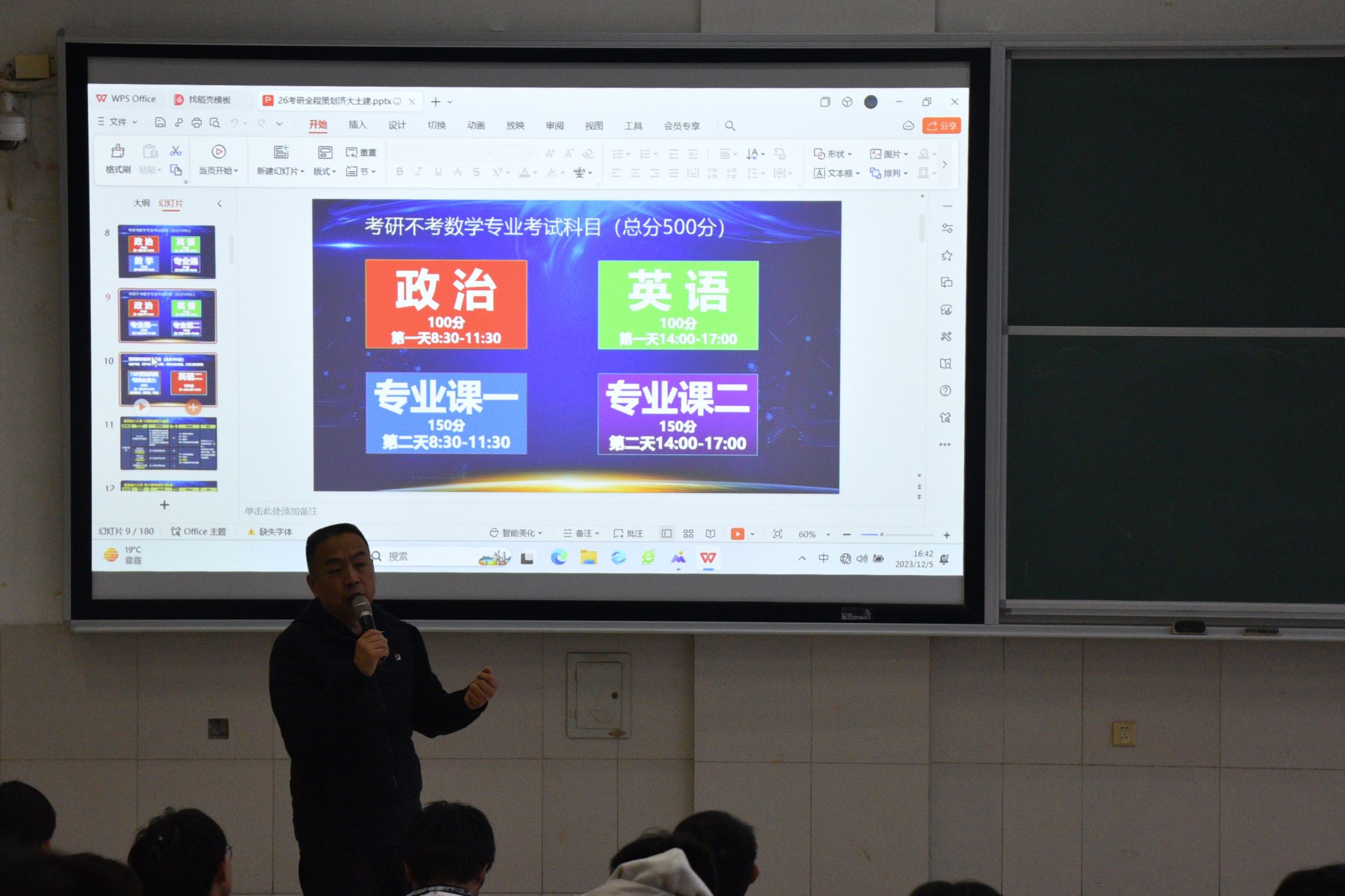 为方便学生提前了解考研政策和大方向,做好考研规划,天天棋牌 于12月5日下午在第二教学楼开展2022级考研动员大会。全体2022级同学参加会议。