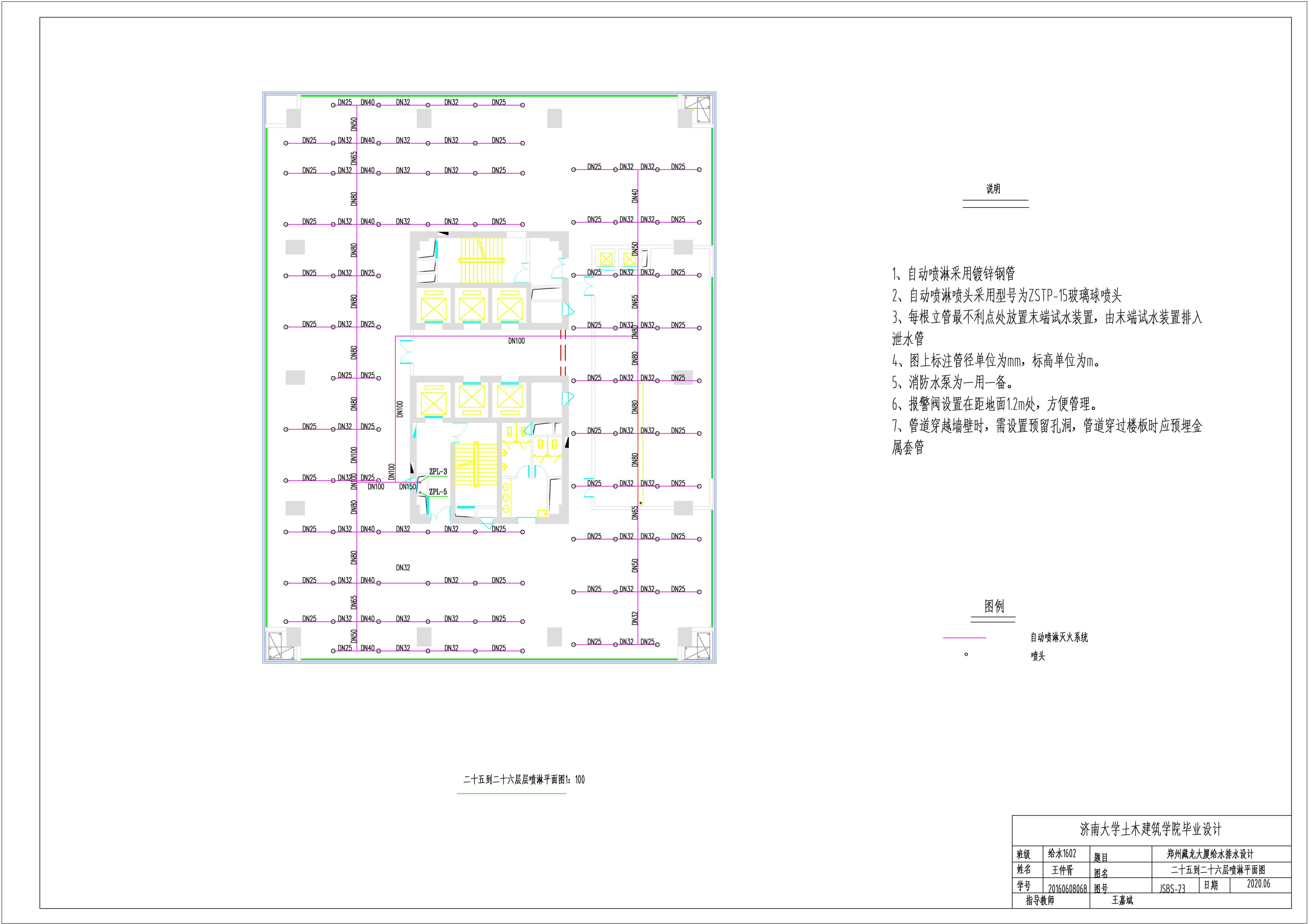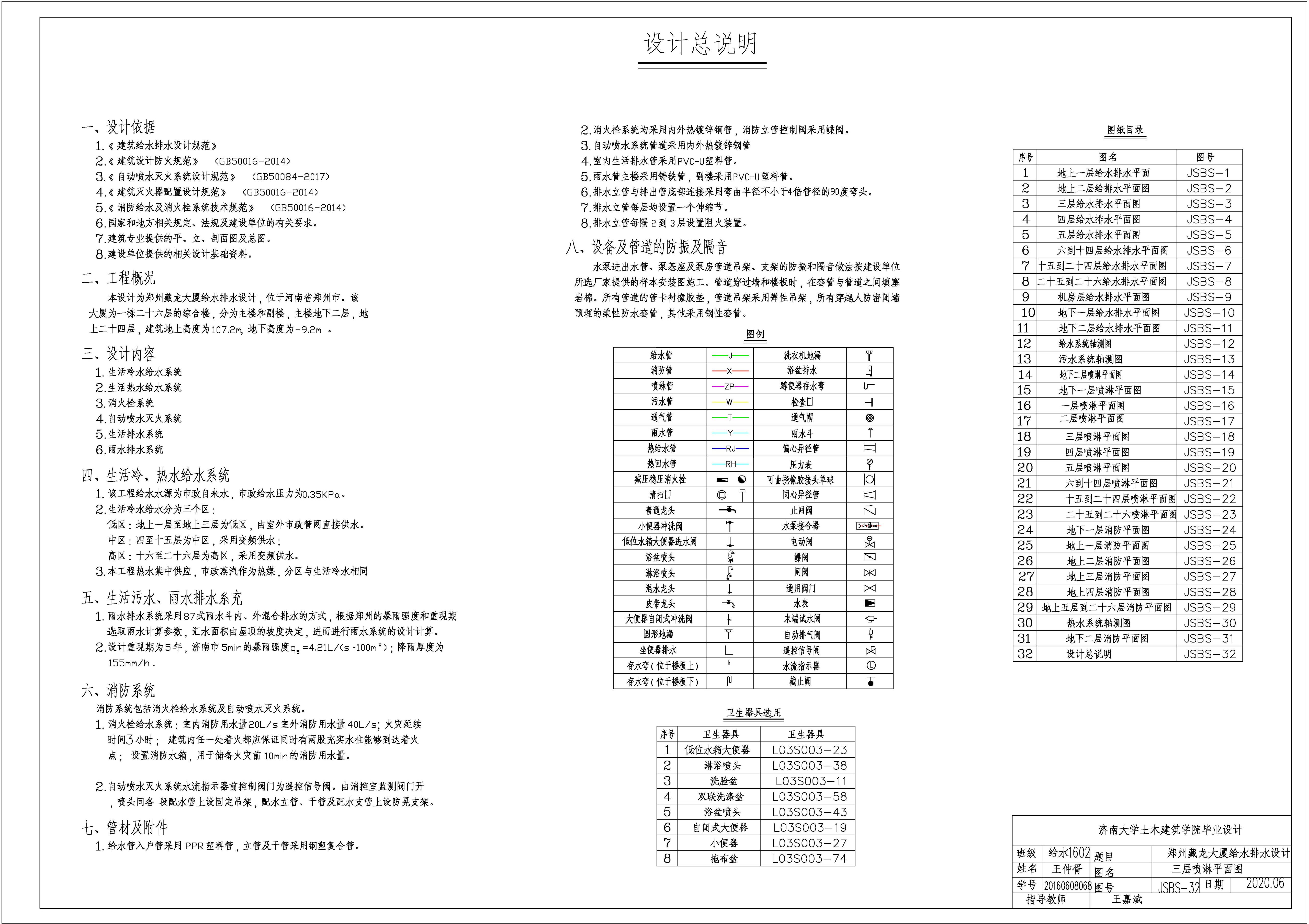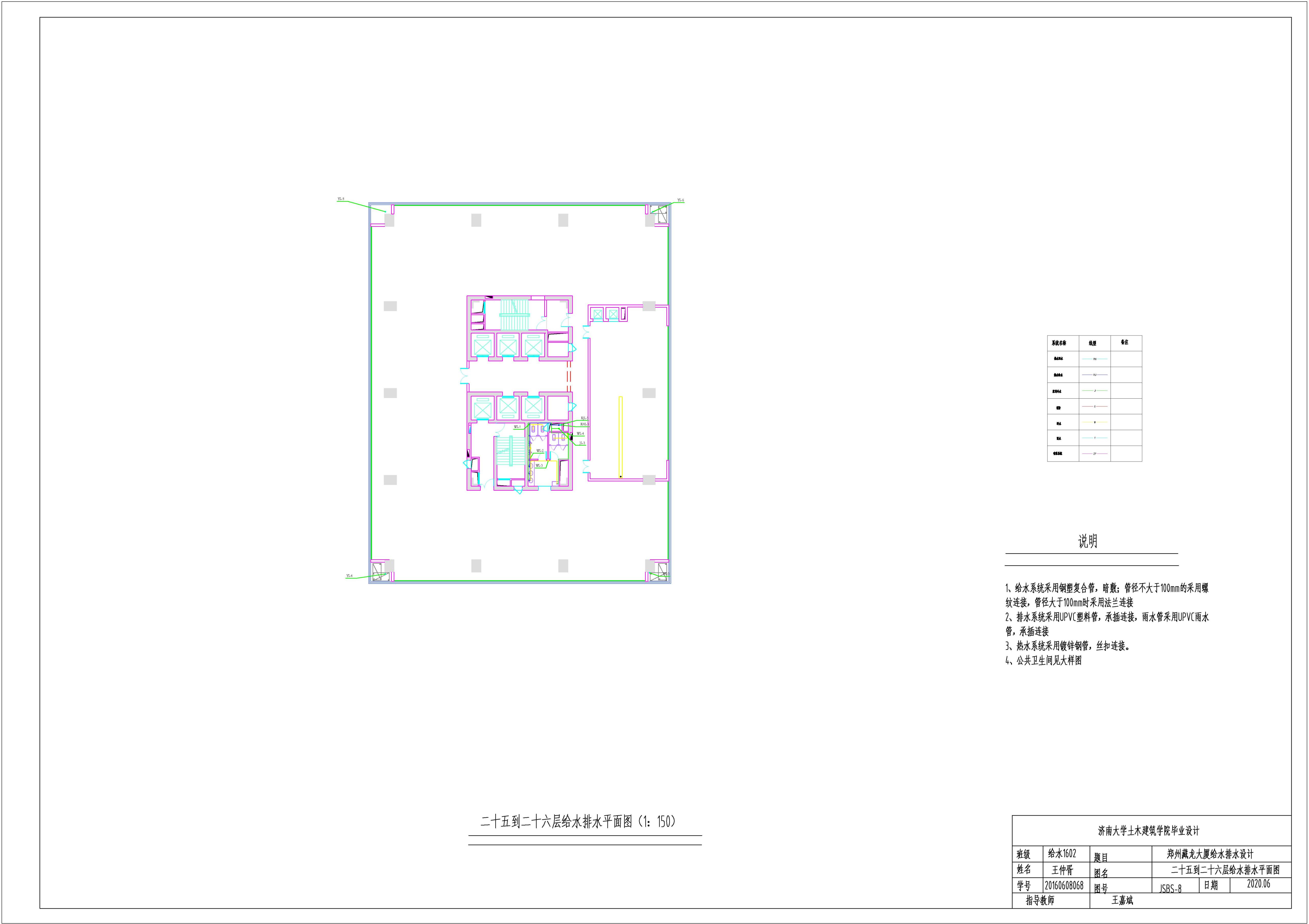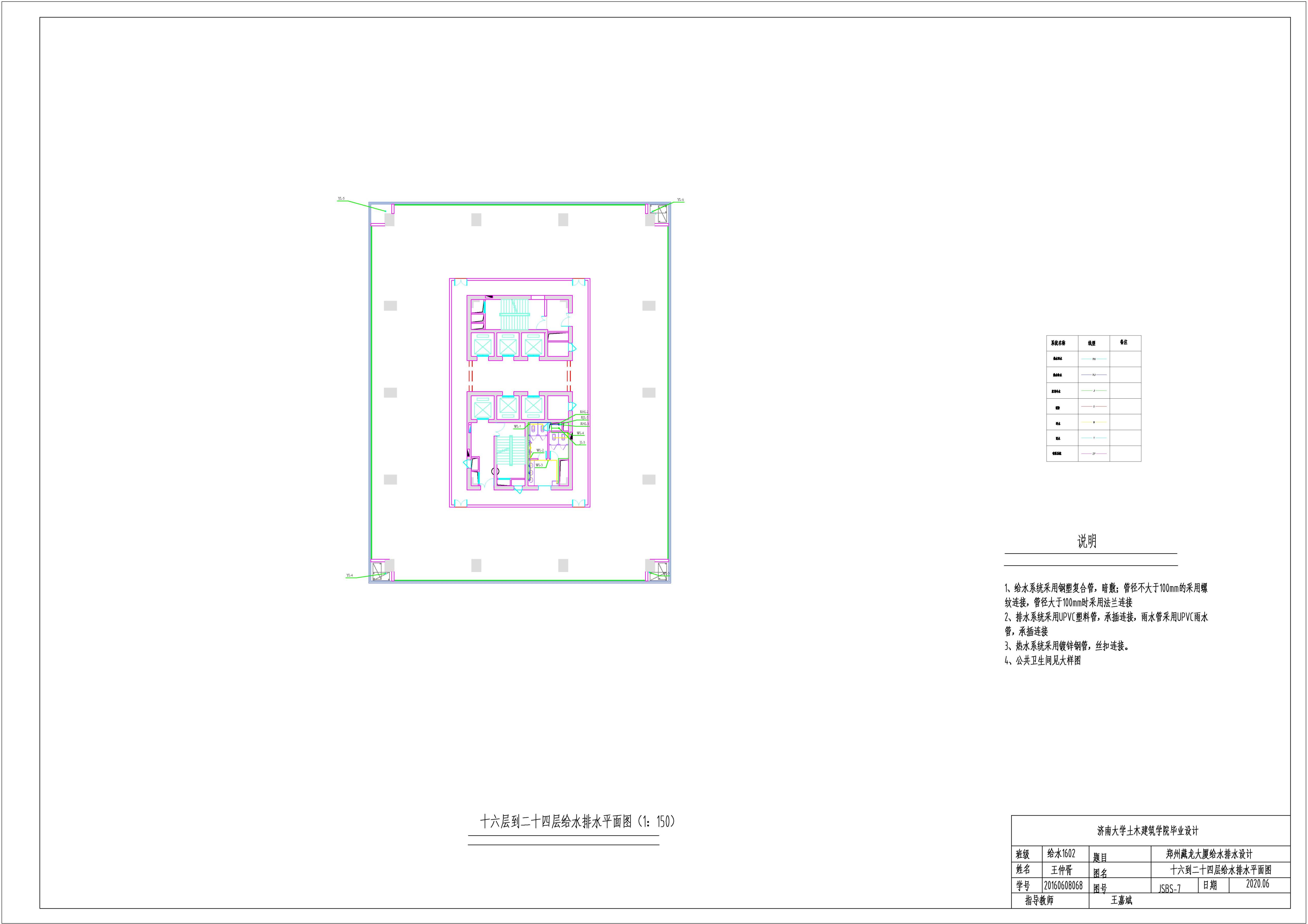 设计简介:本设计运用BIM技术进行毕业设计的全程设计,运用Revit软件进行全部设计。本设计是二十七层的综合性高层建筑的建筑给水排水设计,其中包含:给水系统、排水系统、雨水系统、自动喷淋灭火系统,消防栓系统以及热水包括热水循环系统。给水系统采用竖向分区,分为高、中、低三个区进行供给。一层到三层为低区,由市政管网直接供水;地上四层到地上十五层为中区,由生活泵房内的变频水泵直接提供;十六层到二十六层为高区,由水泵房内变频水泵直接提供。排水系统采用污废水合流排放,地上二层及以上的污废水由重力自流到地下一层排出室外,地上一层单独设置排出。热水系统采用竖向分区供水,分区方式与生活给水系统分区一致,热源系统采用市政蒸汽,同时设置热水循环系统,生活泵房设置在地下一层。雨水排水系统采用单雨水斗排水系统,按照郑州当地的暴雨强度与重现期选取雨水计算参数,进行雨水的设计,流入室外雨水检查井,并排入雨水管网。消防系统用水采用消防水池,消防水池放置在地下二层中。消防水箱设置在屋顶机房层。消火栓系统水平管各层成环,自动喷淋灭火系统由地下二层消防水泵直接供水,与室内消防栓灭火系统共用消防水泵。