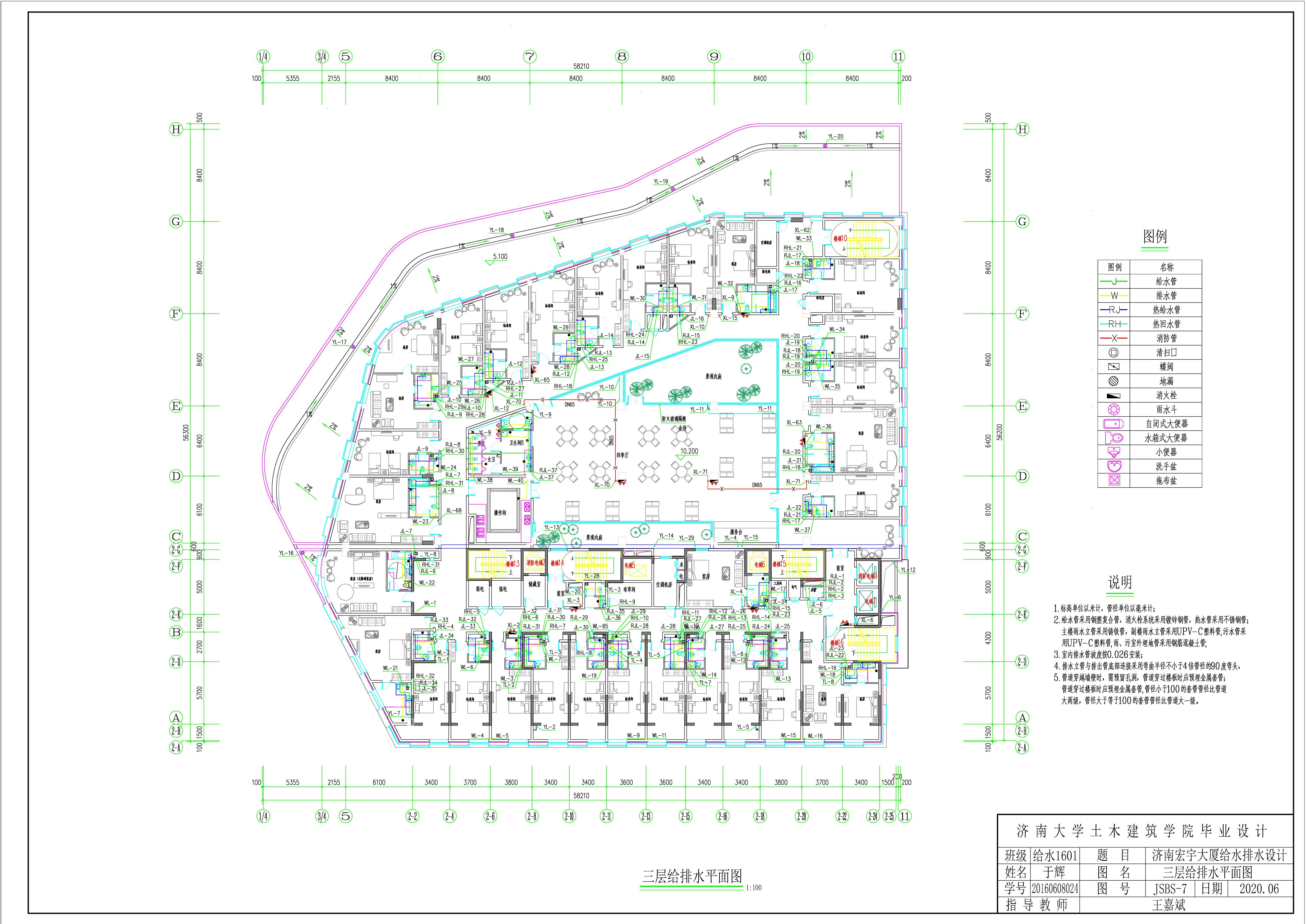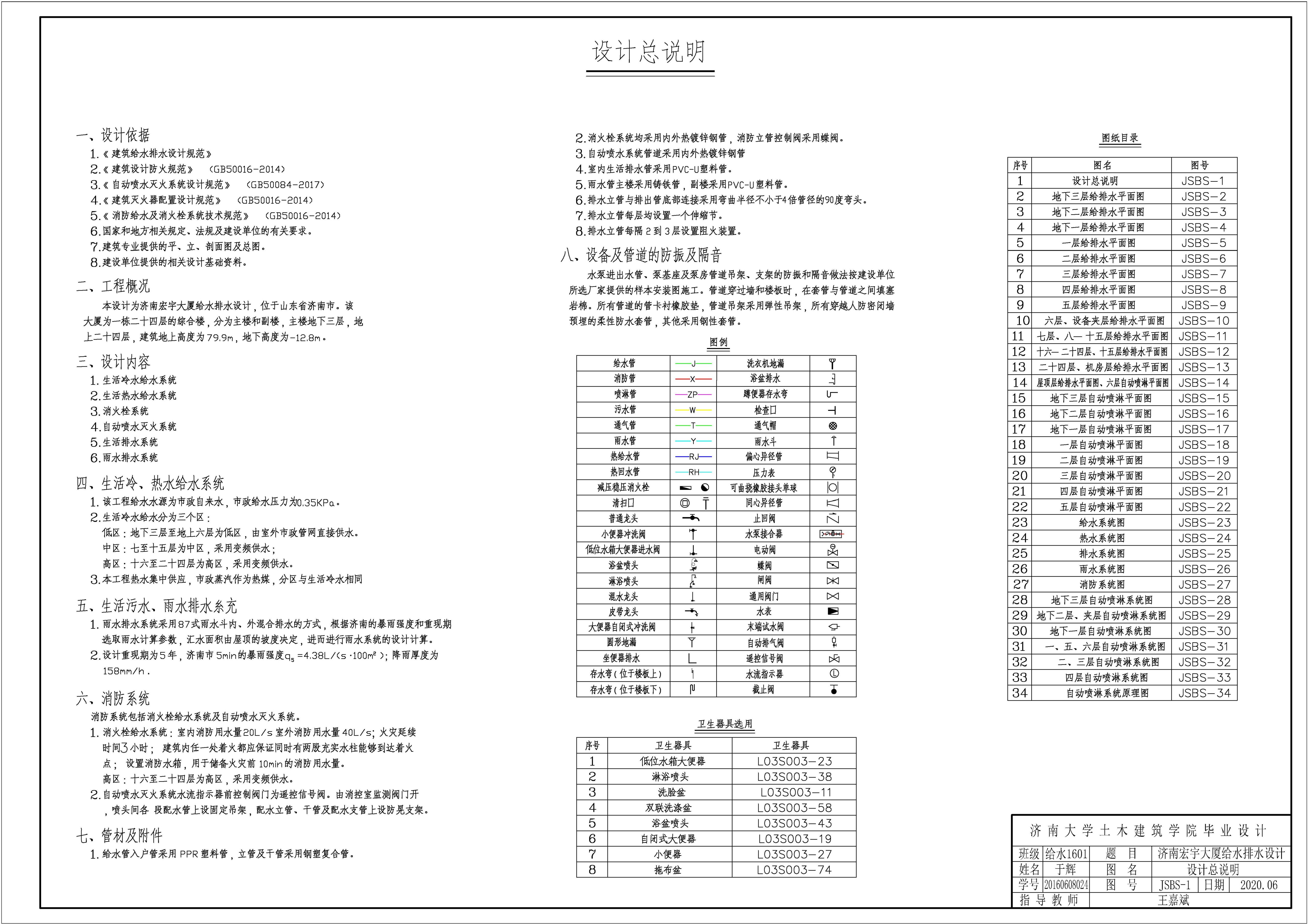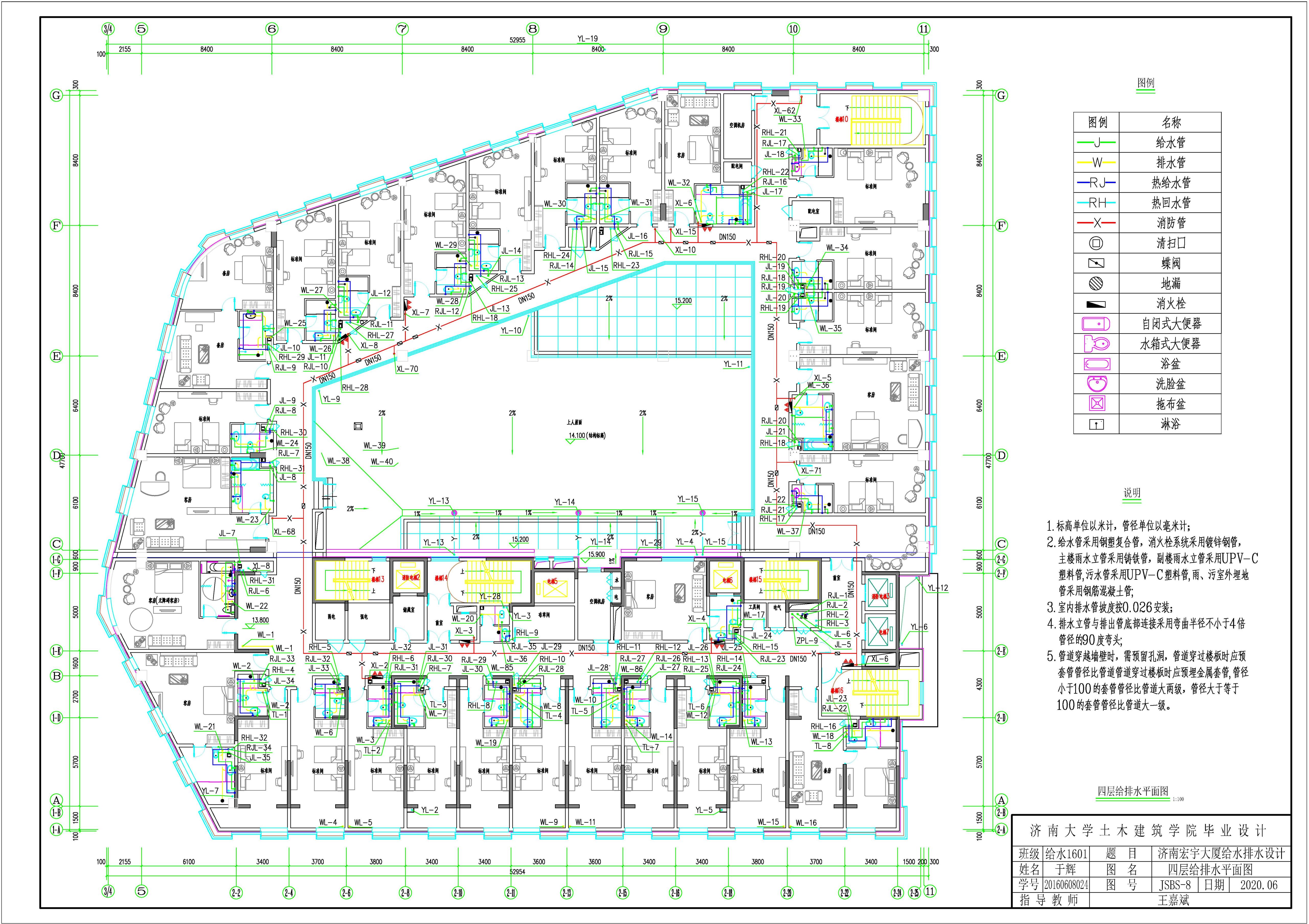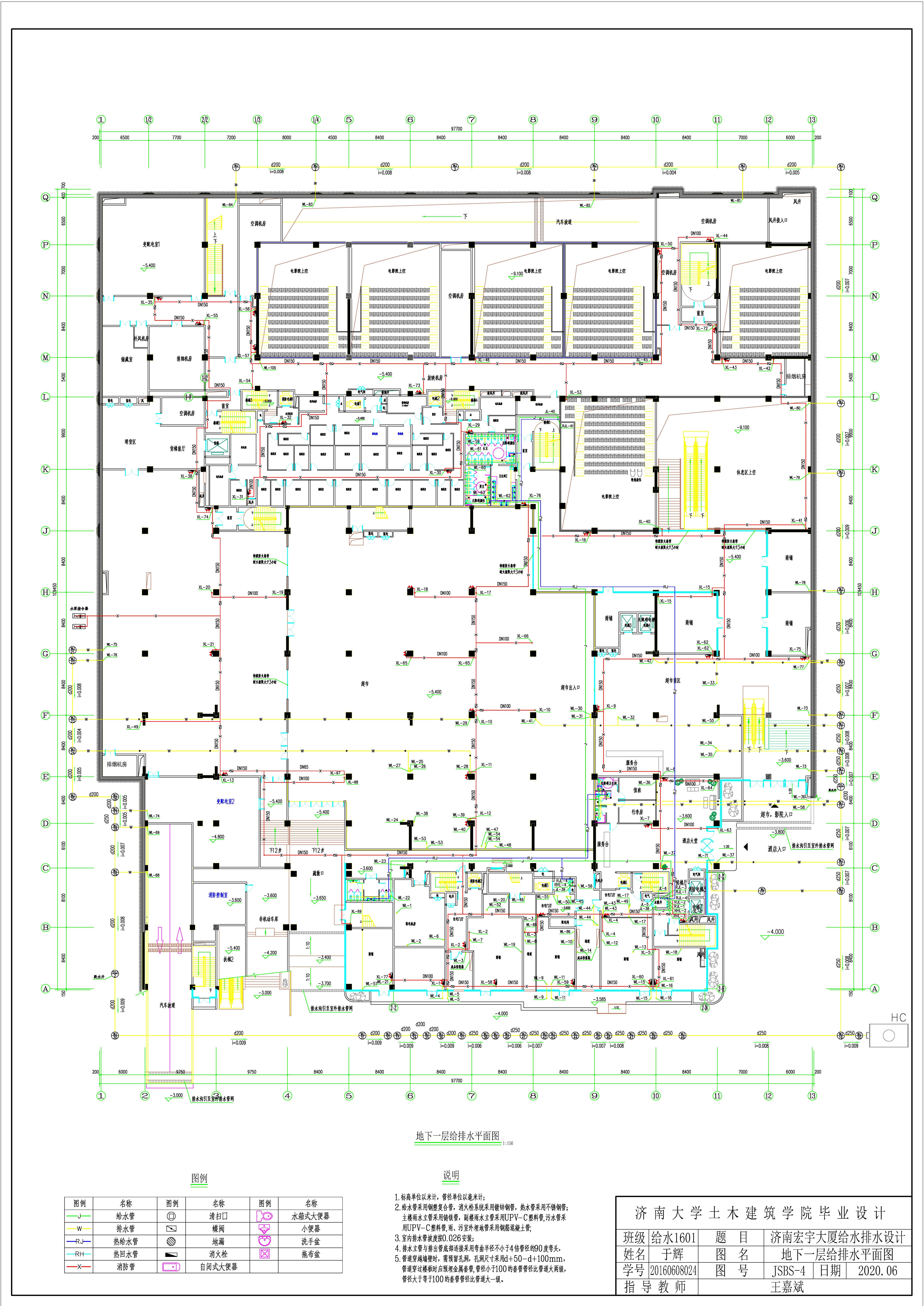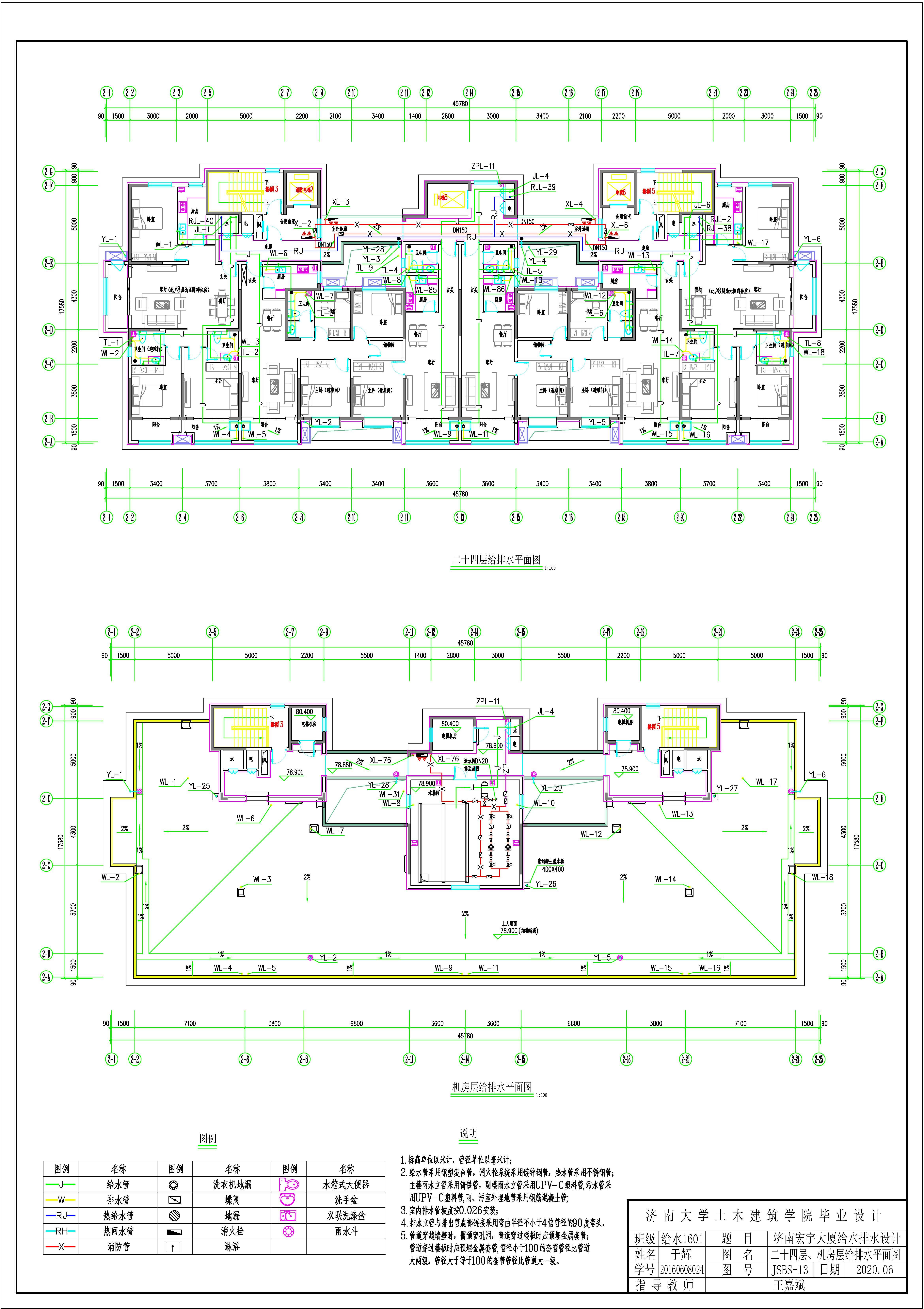 设计内容:济南宏宇大厦给水排水系统设计,本设计为二十四层的高层综合楼,位于济南市,建筑地上高度为79.9m,地下高度为-12.8m。该建筑分为主楼和副楼两部分,主楼地下三层(不包含夹层),地上二十四层(不包含设备层和机房层),副楼地下三层,地上四层。建筑副楼地上一至二层为商店,三至四层为宾馆,主楼地上一至二层为商店,三至六层为宾馆,七至二十层为住宅。地下一层由商店、储藏室、超市和电影院组成;地下二层由电影院、停车场和储藏室组成;地下三层由停车场和储藏室组成。建筑地下一、二、三层建筑面积为10302.65 m2,地上一层建筑面积2785.71m2,高层建筑面积576.53m2 。