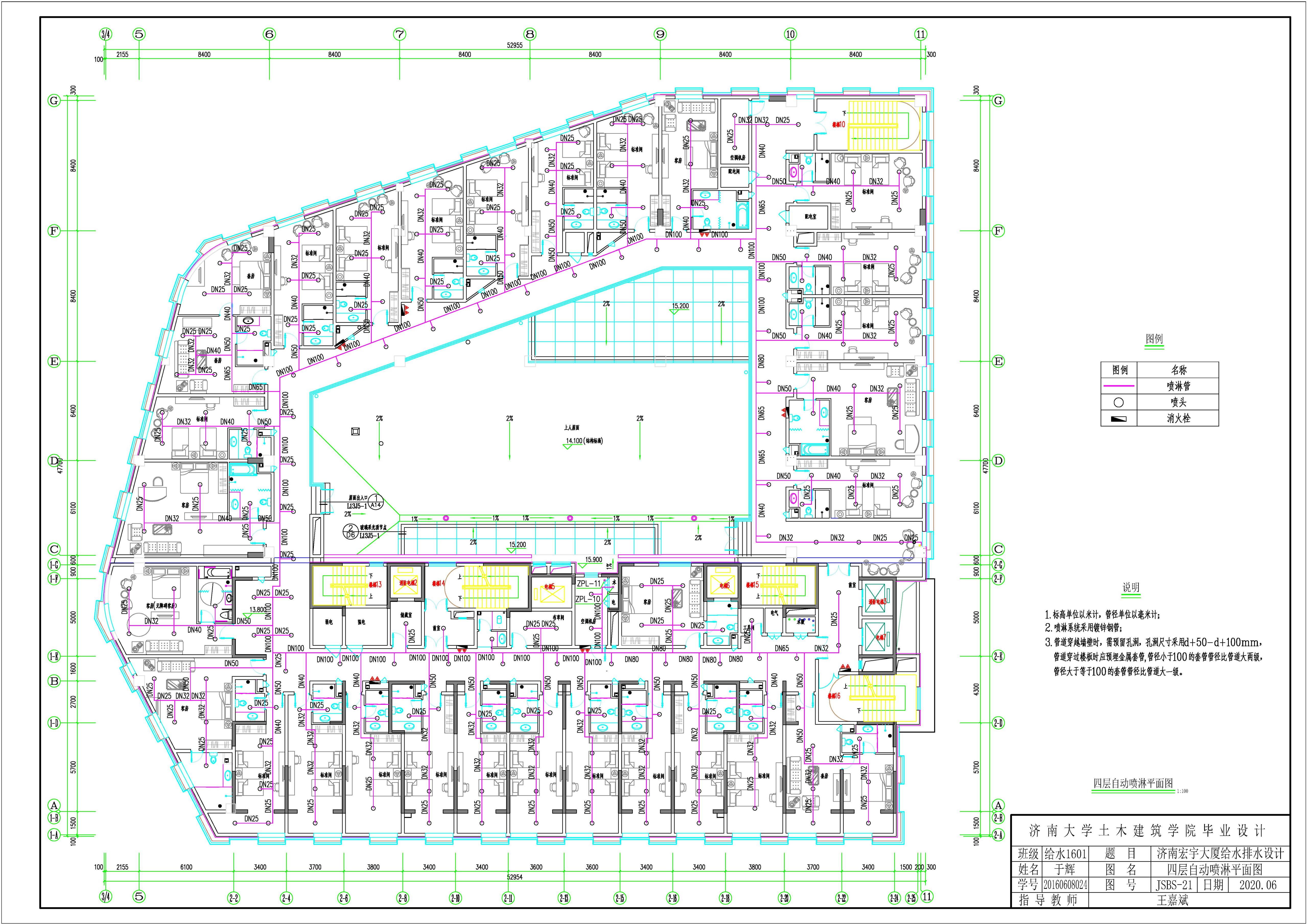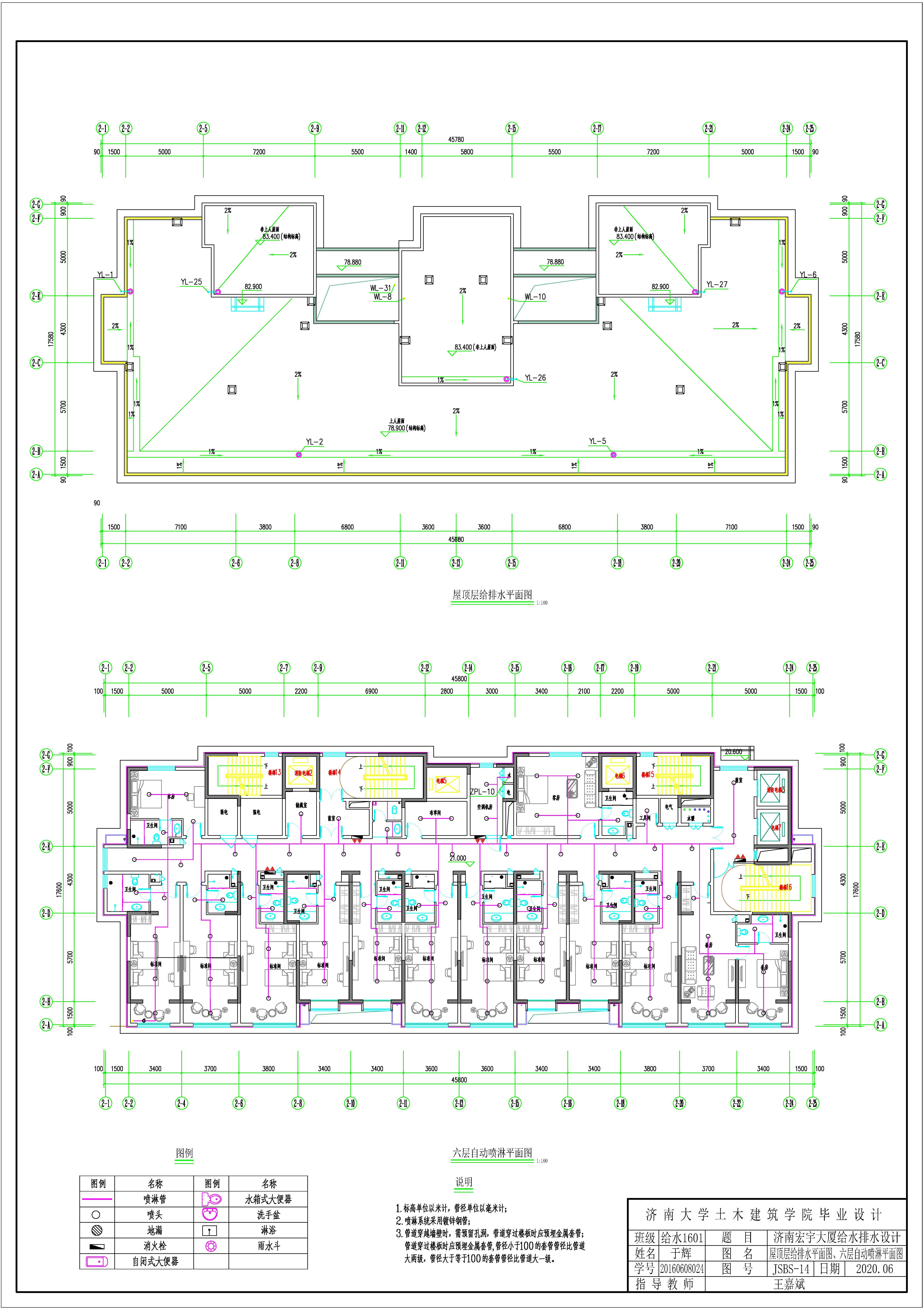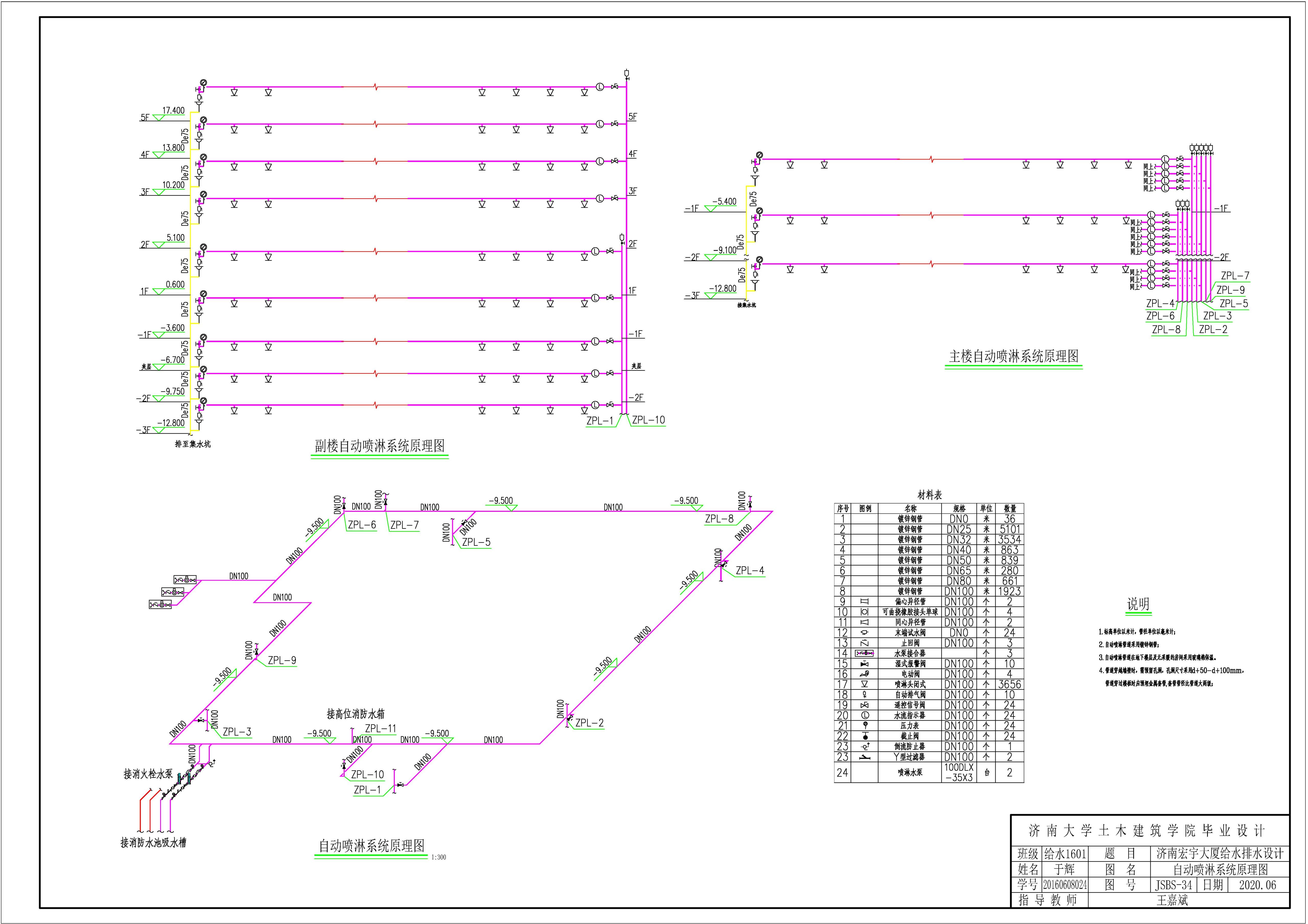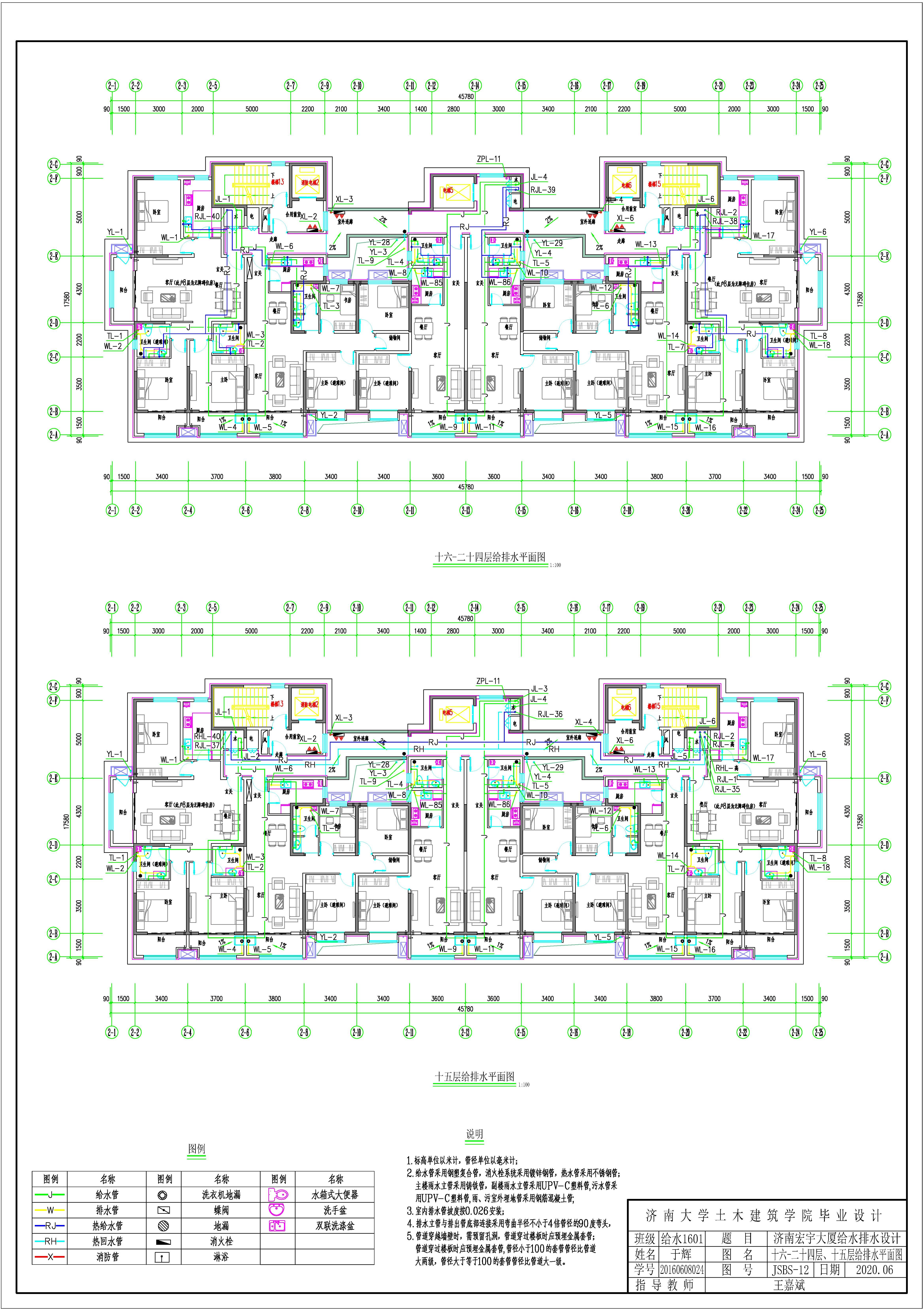 设计内容:济南宏宇大厦给水排水系统设计,本设计为二十四层的高层综合楼,位于济南市,建筑地上高度为79.9m,地下高度为-12.8m。该建筑分为主楼和副楼两部分,主楼地下三层(不包含夹层),地上二十四层(不包含设备层和机房层),副楼地下三层,地上四层。建筑副楼地上一至二层为商店,三至四层为宾馆,主楼地上一至二层为商店,三至六层为宾馆,七至二十层为住宅。地下一层由商店、储藏室、超市和电影院组成;地下二层由电影院、停车场和储藏室组成;地下三层由停车场和储藏室组成。建筑地下一、二、三层建筑面积为10302.65 m2,地上一层建筑面积2785.71m2,高层建筑面积576.53m2 。