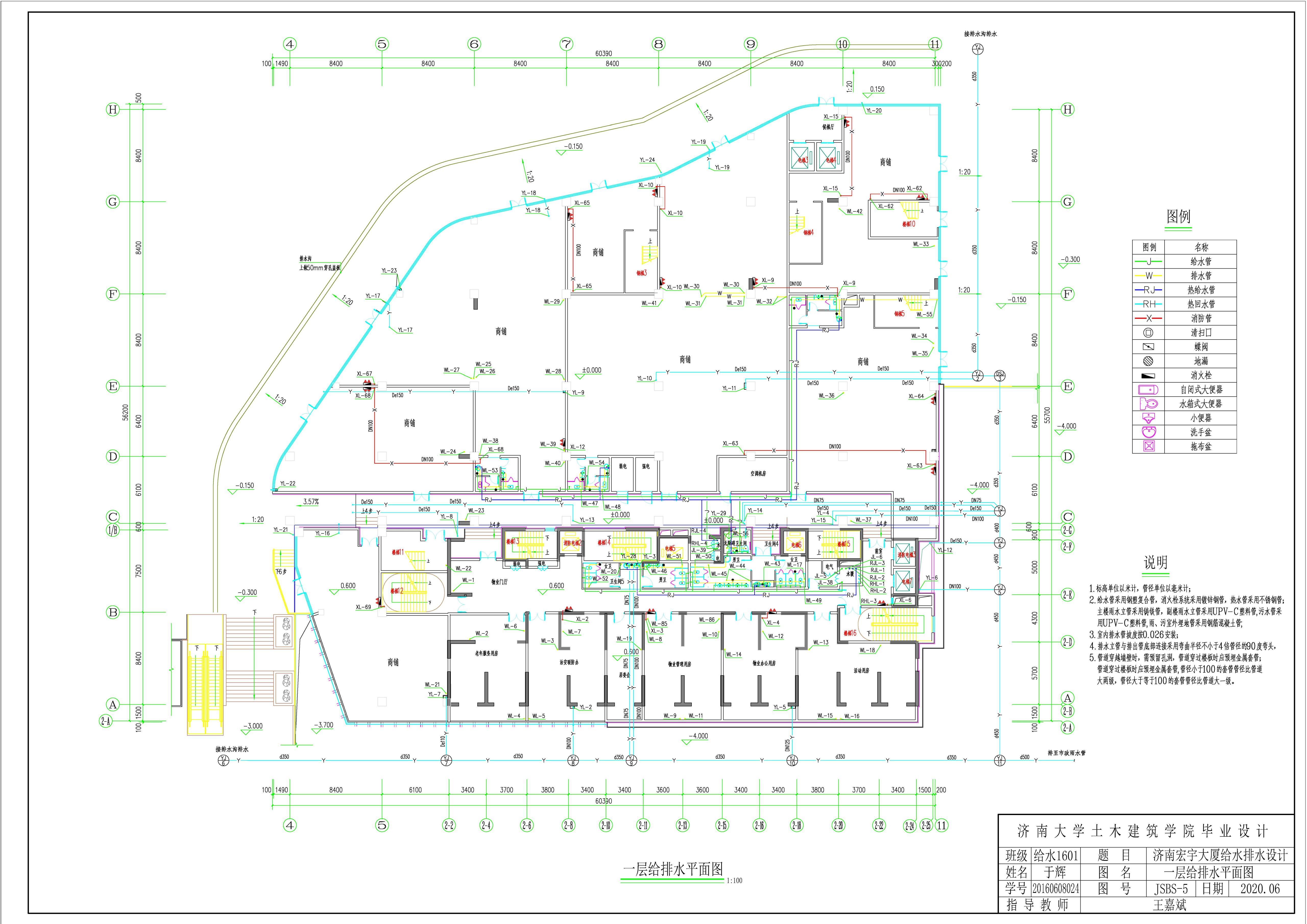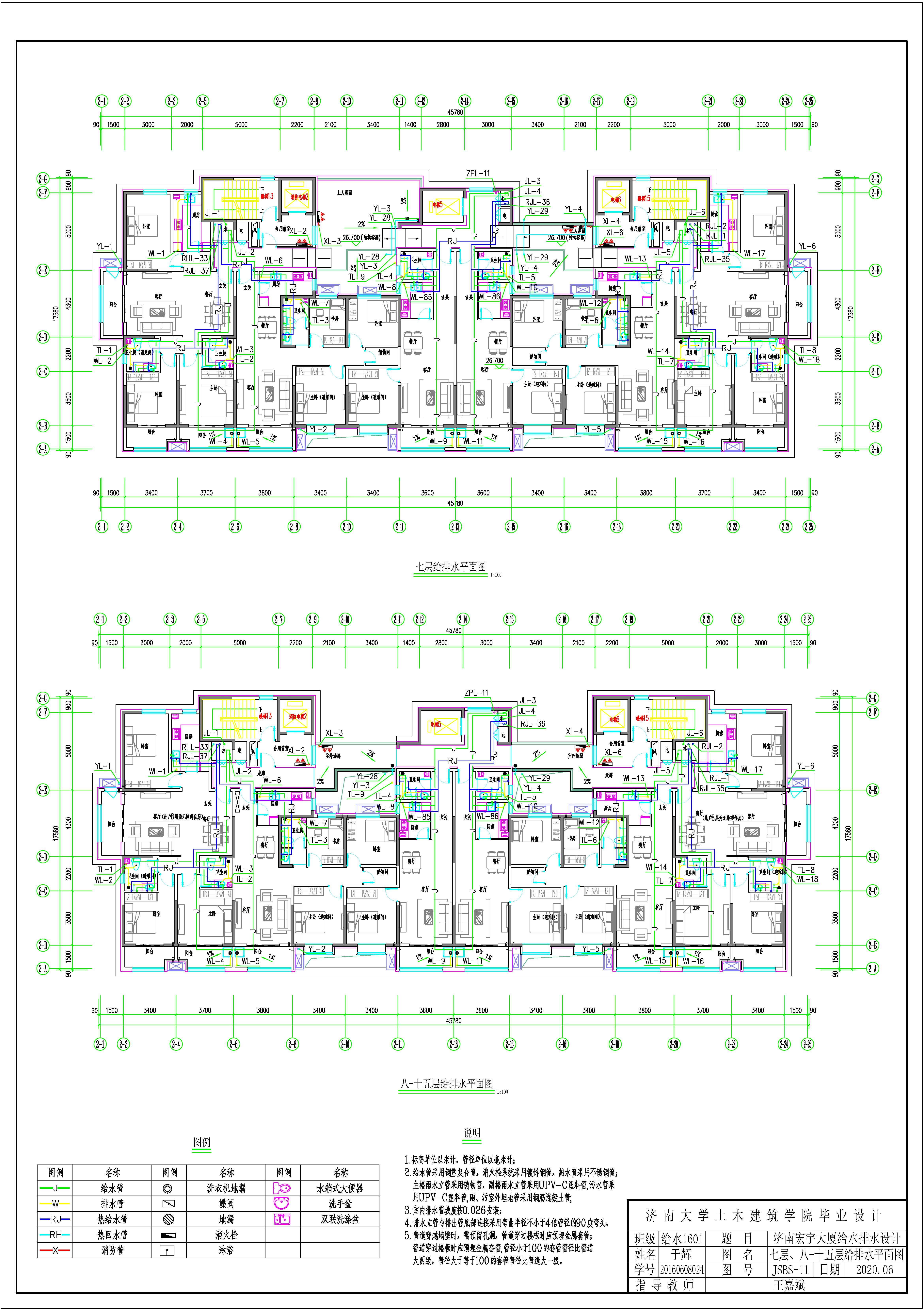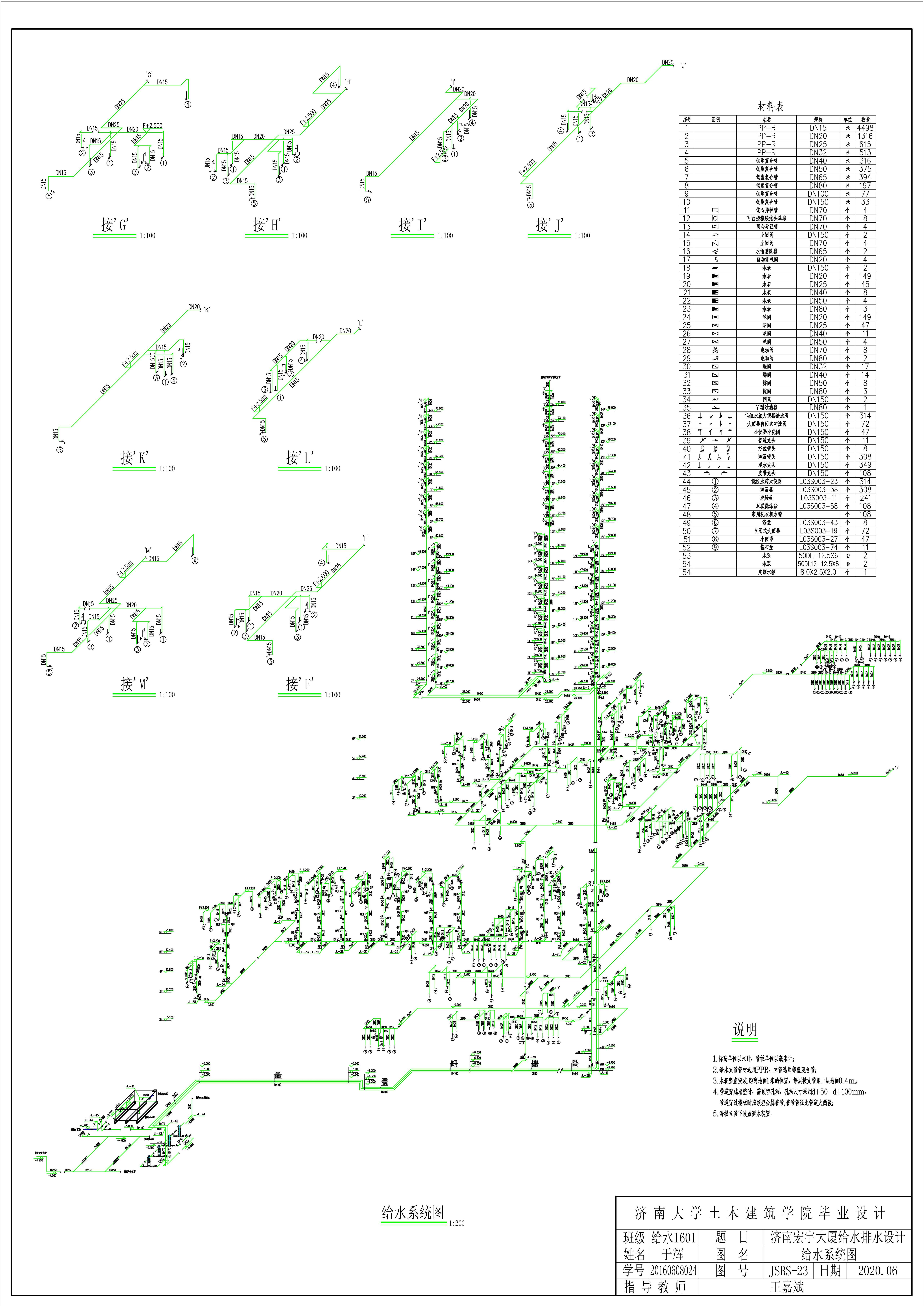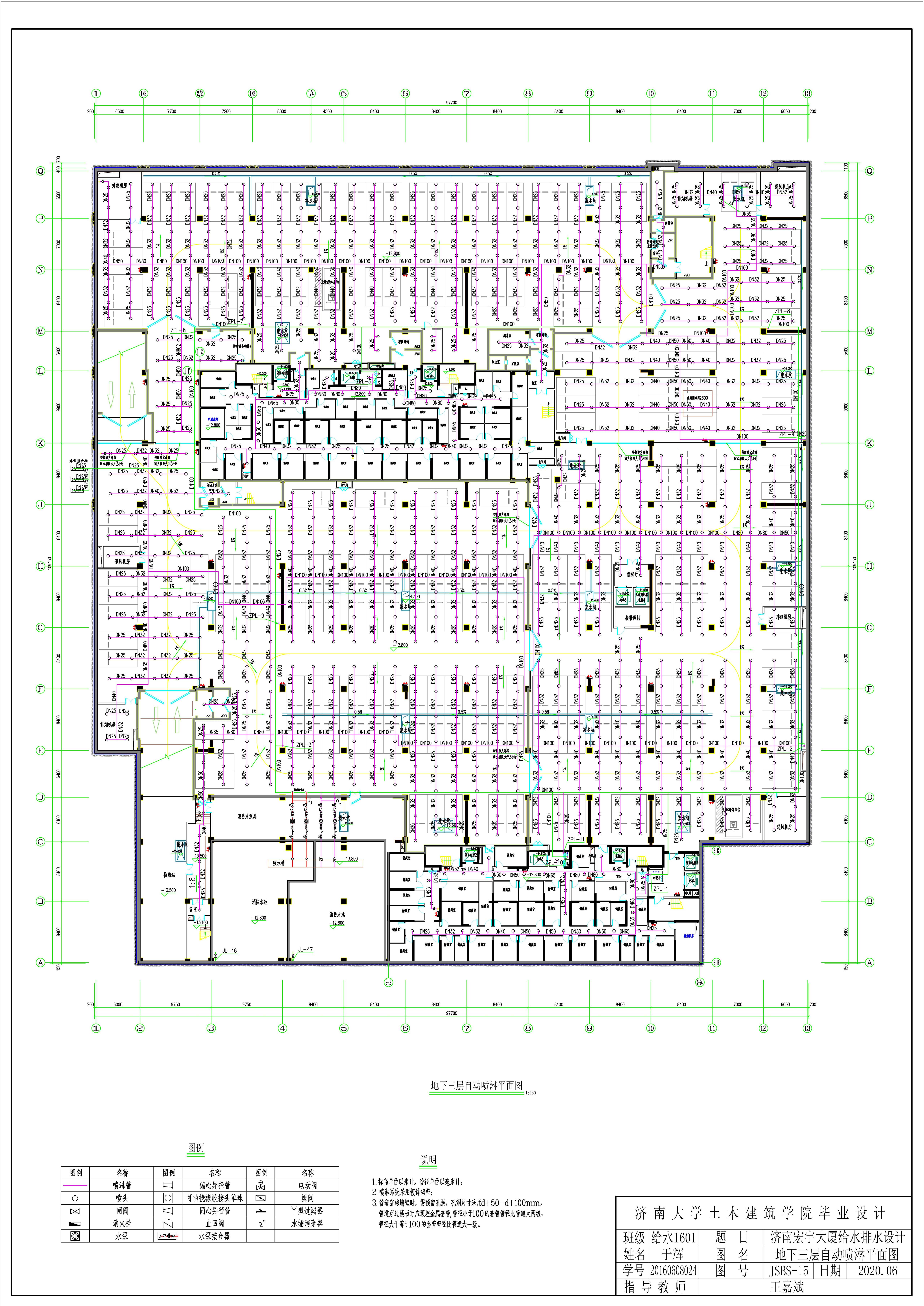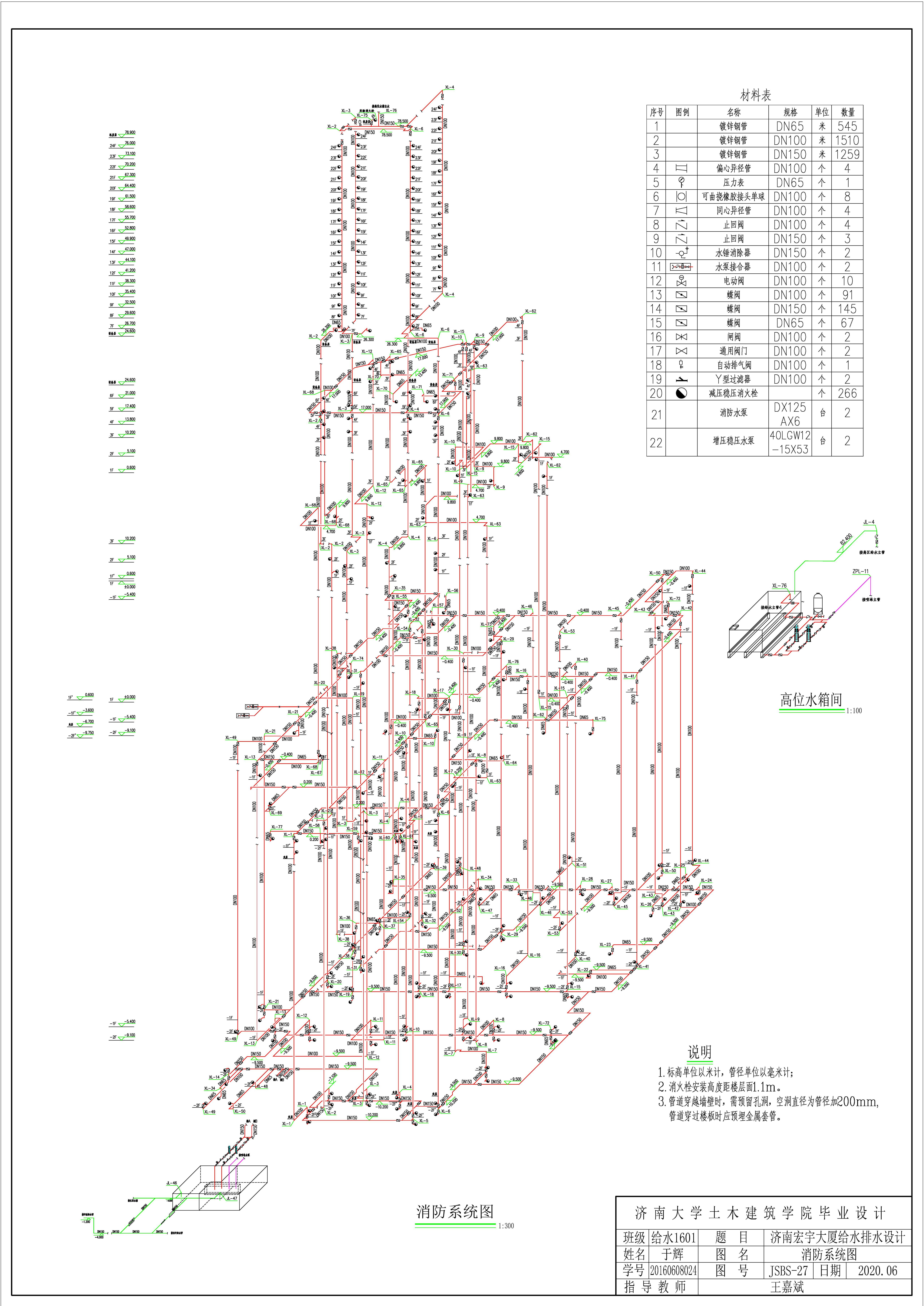 设计内容:济南宏宇大厦给水排水系统设计,本设计为二十四层的高层综合楼,位于济南市,建筑地上高度为79.9m,地下高度为-12.8m。该建筑分为主楼和副楼两部分,主楼地下三层(不包含夹层),地上二十四层(不包含设备层和机房层),副楼地下三层,地上四层。建筑副楼地上一至二层为商店,三至四层为宾馆,主楼地上一至二层为商店,三至六层为宾馆,七至二十层为住宅。地下一层由商店、储藏室、超市和电影院组成;地下二层由电影院、停车场和储藏室组成;地下三层由停车场和储藏室组成。建筑地下一、二、三层建筑面积为10302.65 m2,地上一层建筑面积2785.71m2,高层建筑面积576.53m2 。