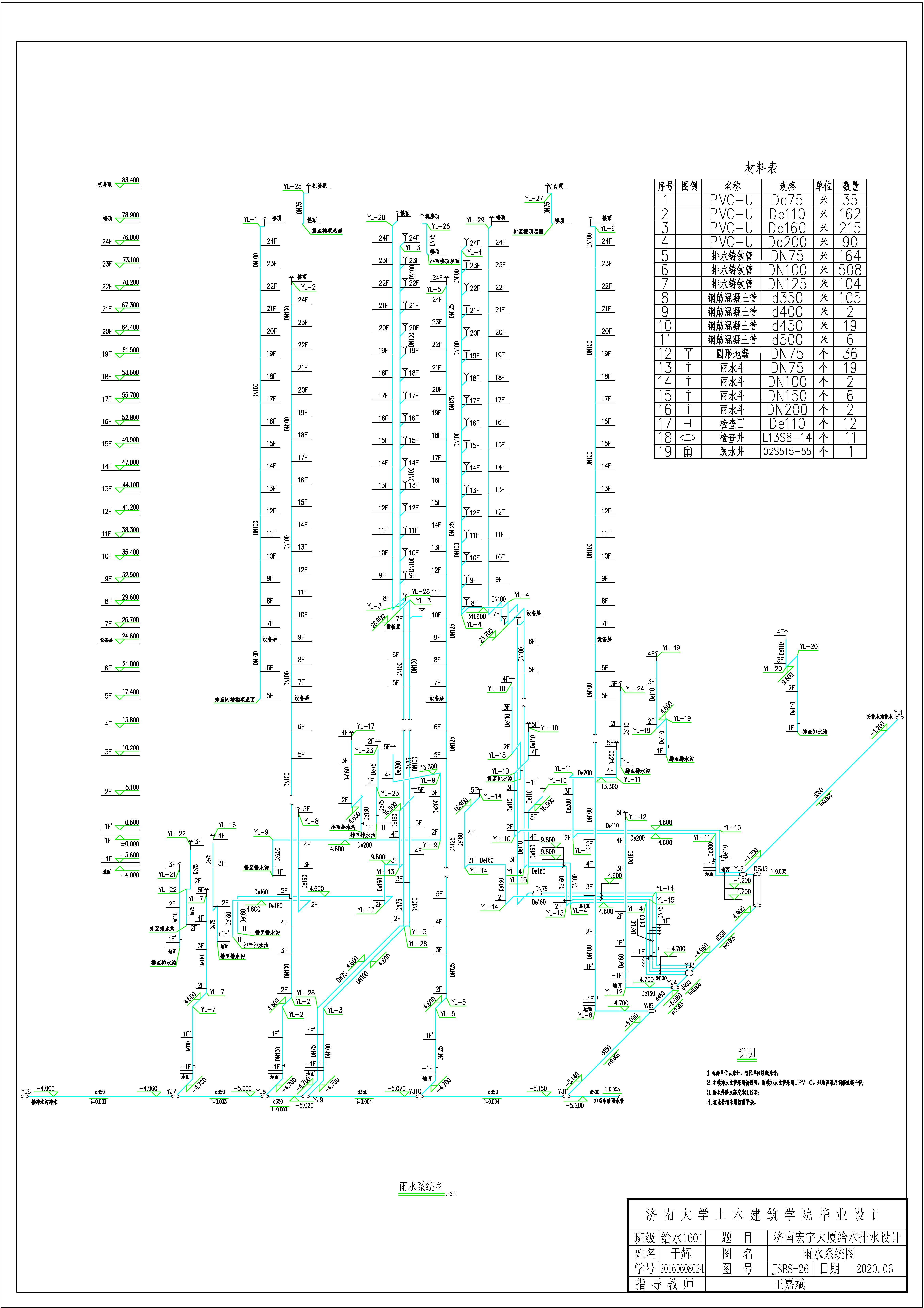 雨水排水系统采用87式雨水斗内、外混合排水的方式,按照济南的重现期和暴雨强度选取雨水计算参数,汇水面积由屋顶的坡度决定,进而进行雨水系统的设计计算。